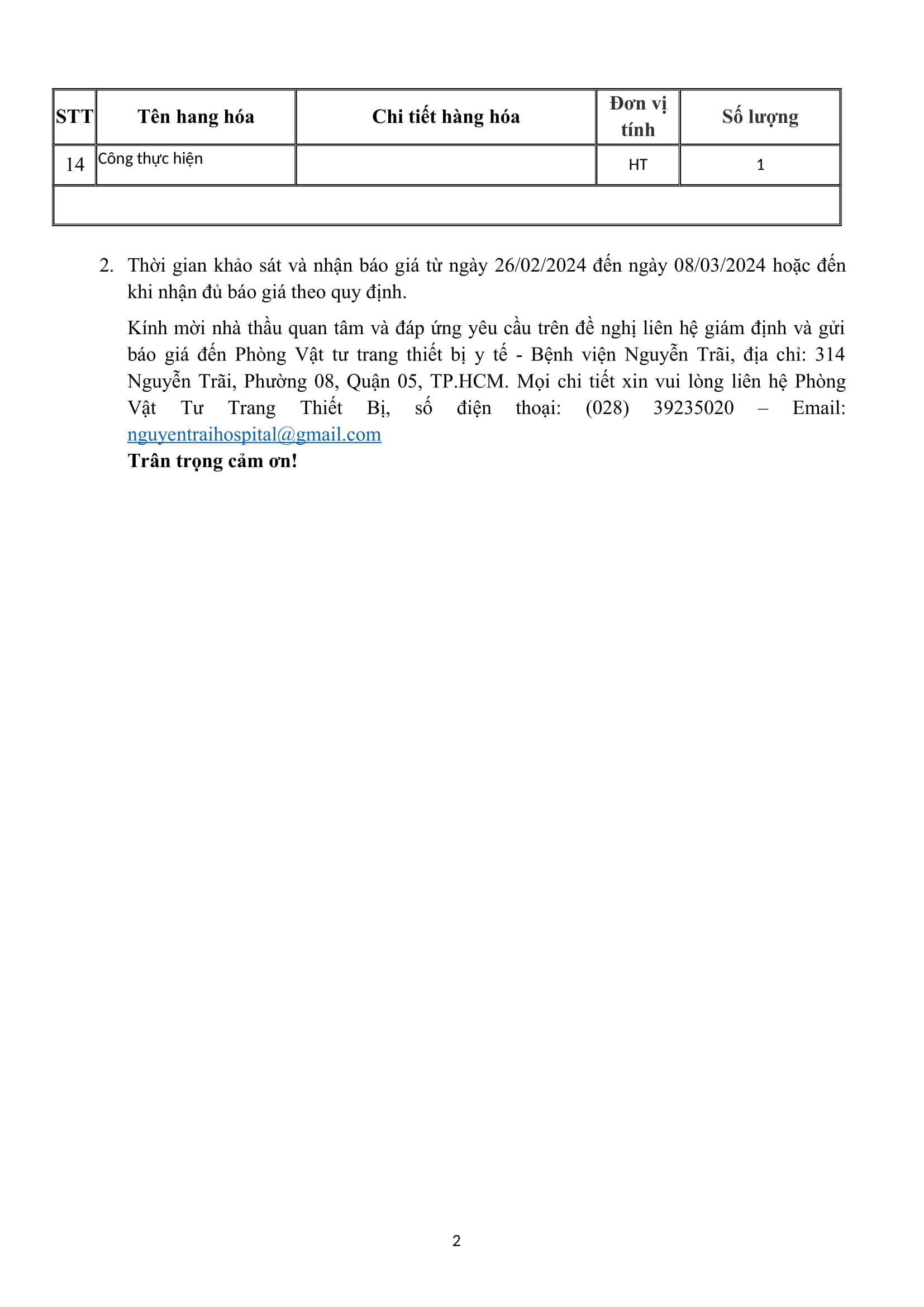 Thư mời chào giá Bệnh viện Nguyễn Trãi đang có nhu cầu cung cấp mới một số linh kiện vật tư cho hệ thống khí y tế hiện hữu phục vụ công tác khám chữa bệnh
