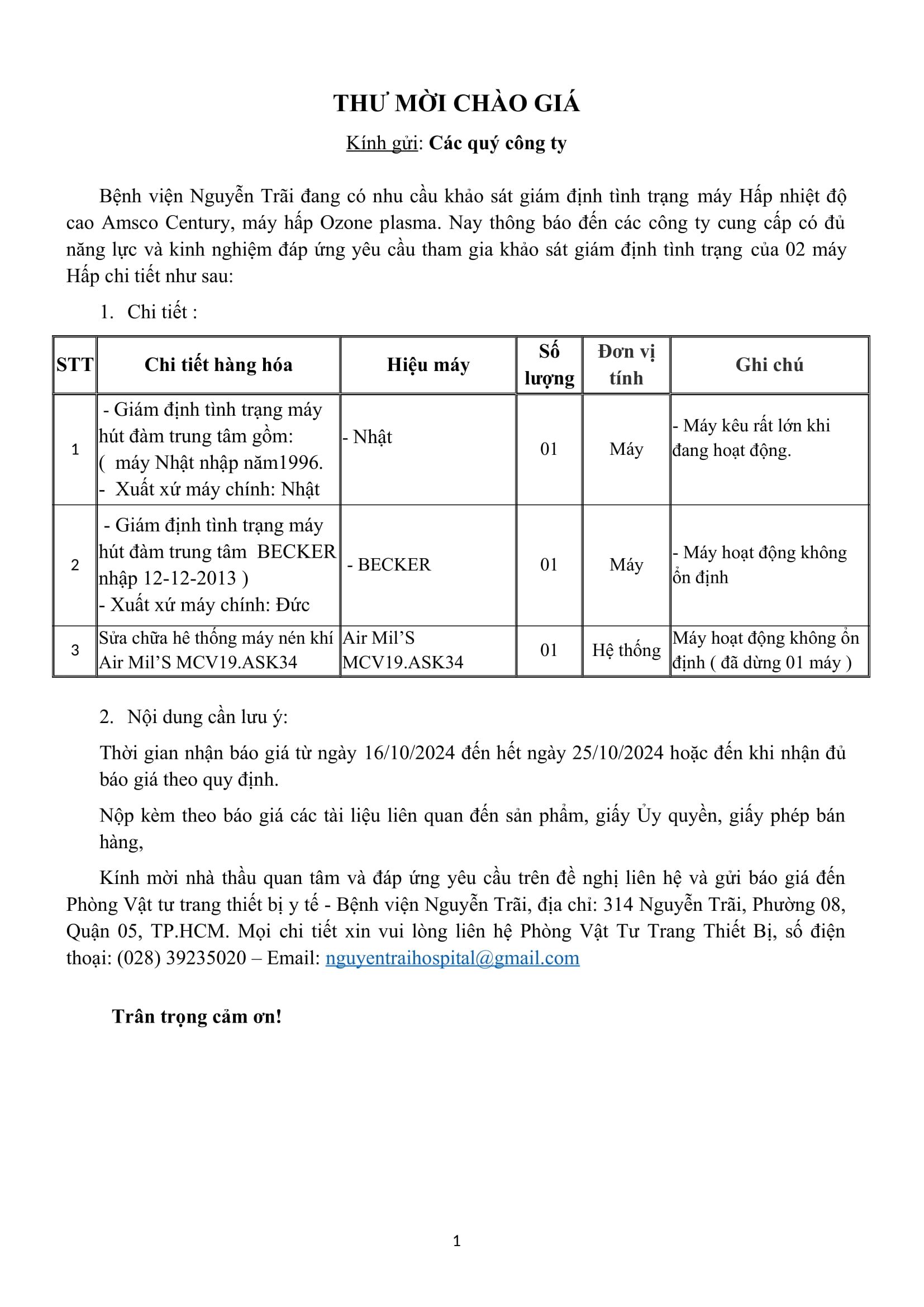 Thư mời chào giá Bệnh viện Nguyễn Trãi đang có nhu cầu khảo sát giám định tình trạng máy hấp nhiệt độ cao Amsco Century, máy hấp Ozone plasma