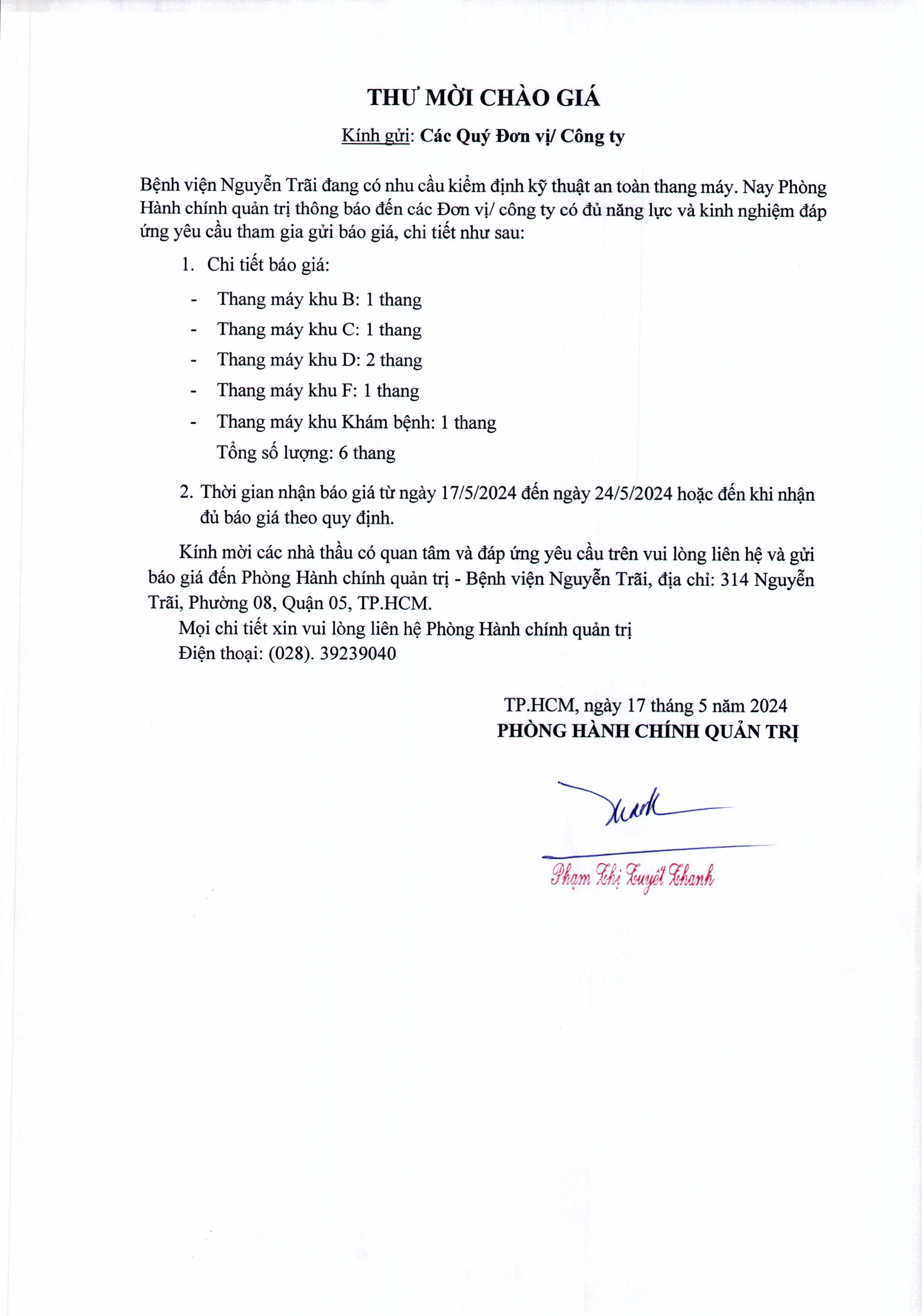 Thư mời chào giá Bệnh viện Nguyễn Trãi đang có nhu cầu kiểm định kỹ thuật an toàn thang máy