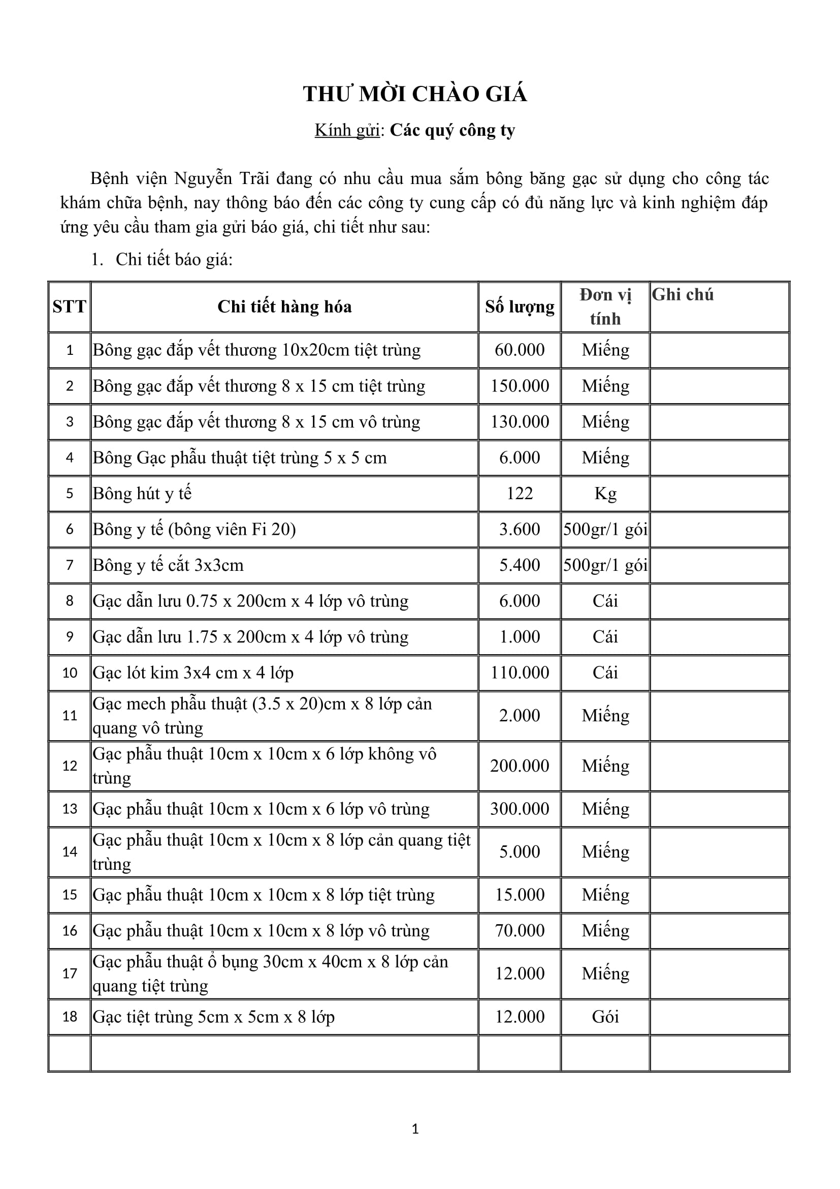 Thư mời chào giá bệnh viện Nguyễn Trãi đang có nhu cầu mua sắm bông băng gạc sử dụng cho công tác khám chữa bệnh