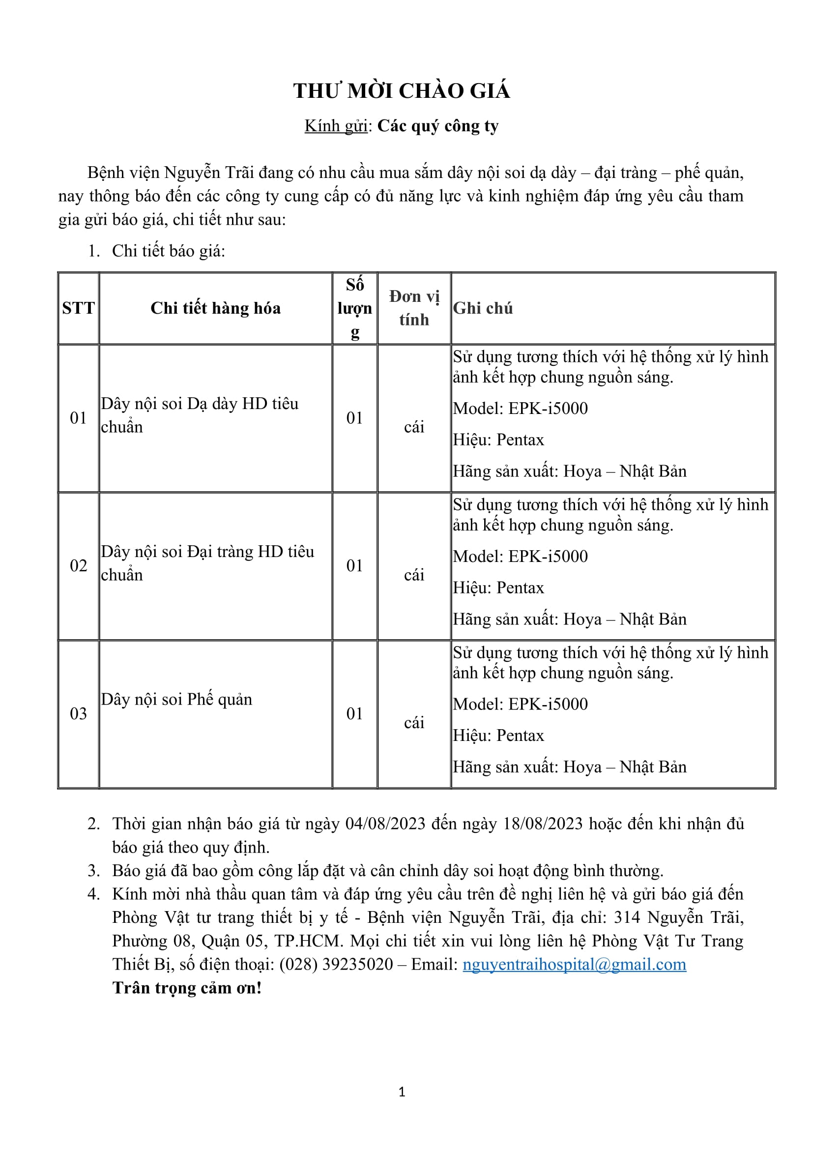 Thư mời chào giá bệnh viện Nguyễn Trãi đang có nhu cầu mua sắm dây nội soi dạ dày-đại tràng- phế quản
