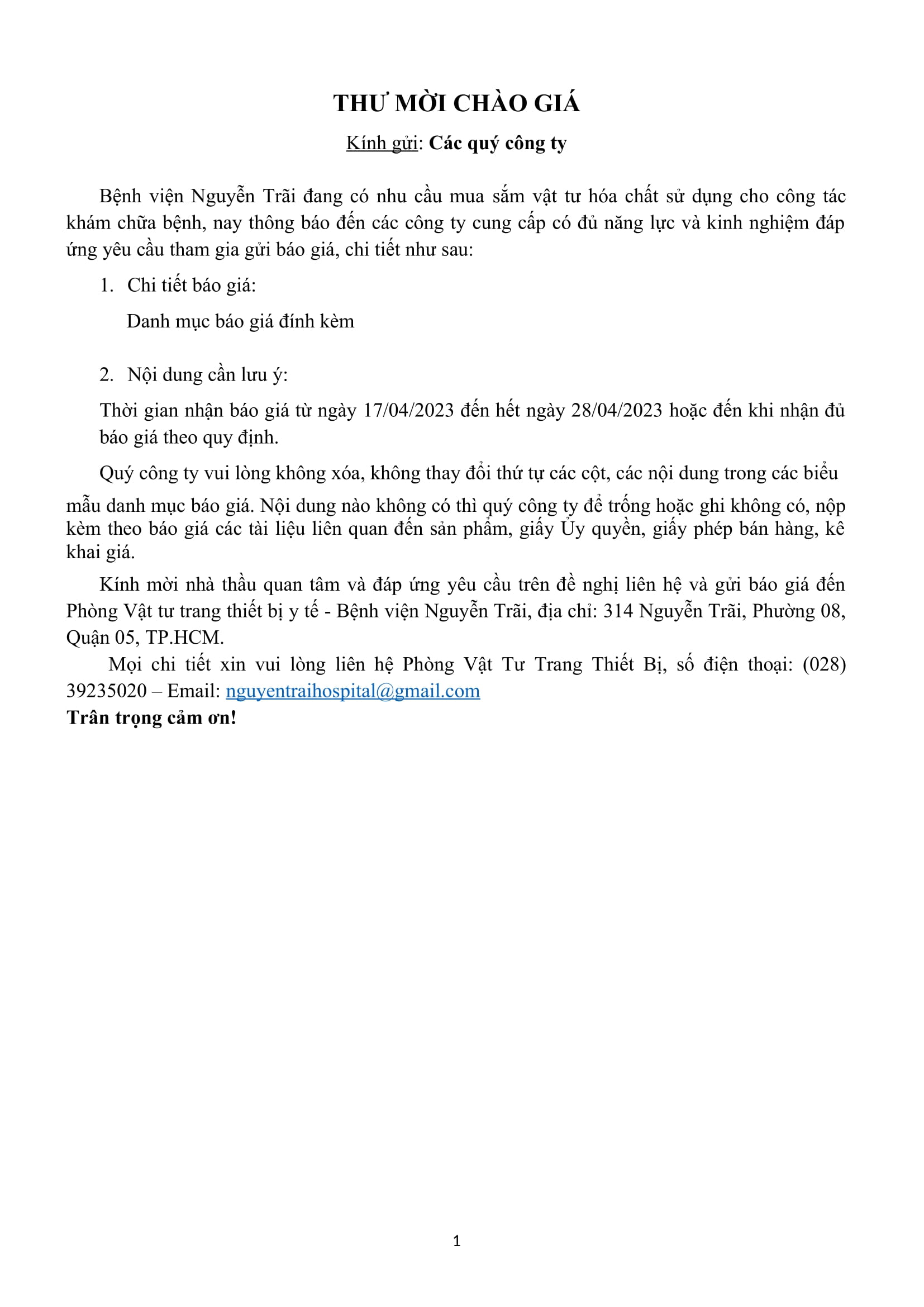 Thư mời chào giá Bệnh viện Nguyễn Trãi đang có nhu cầu mua sắm vật tư hóa chất sử dụng cho công tác khám chữa bệnh