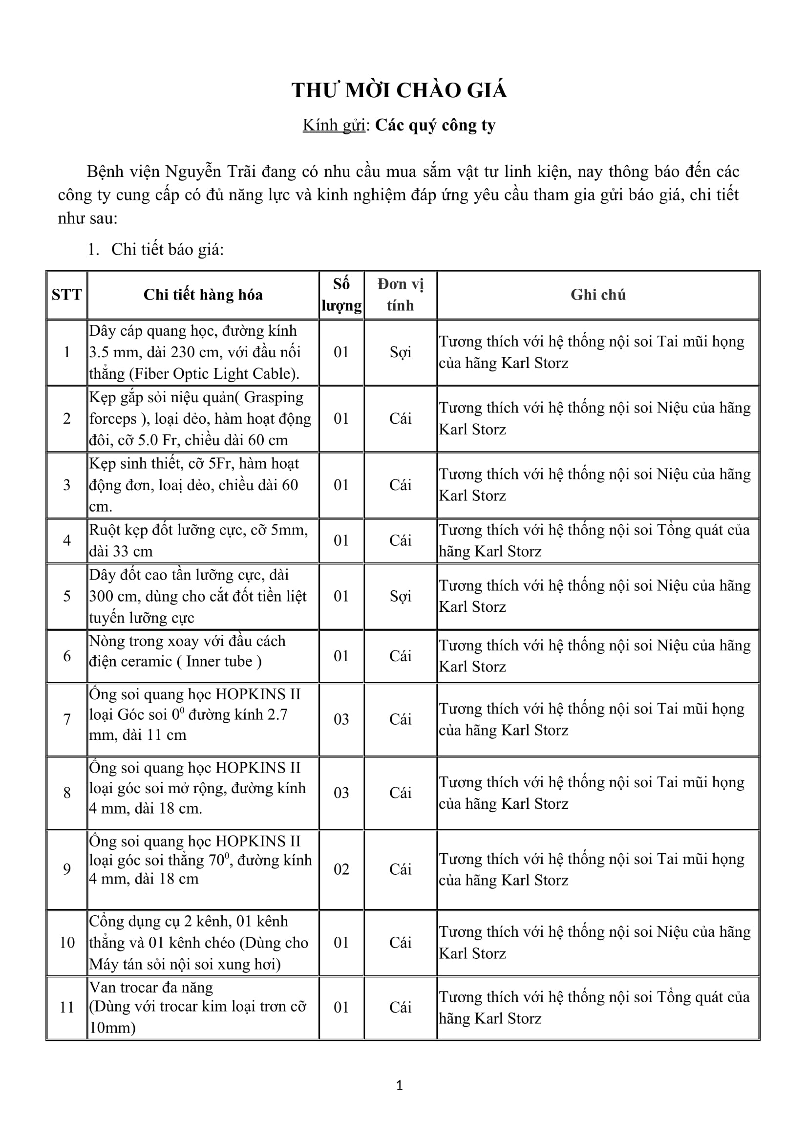 Thư mời chào giá Bệnh viện Nguyễn Trãi đang có nhu cầu mua sắm vật tư linh kiện