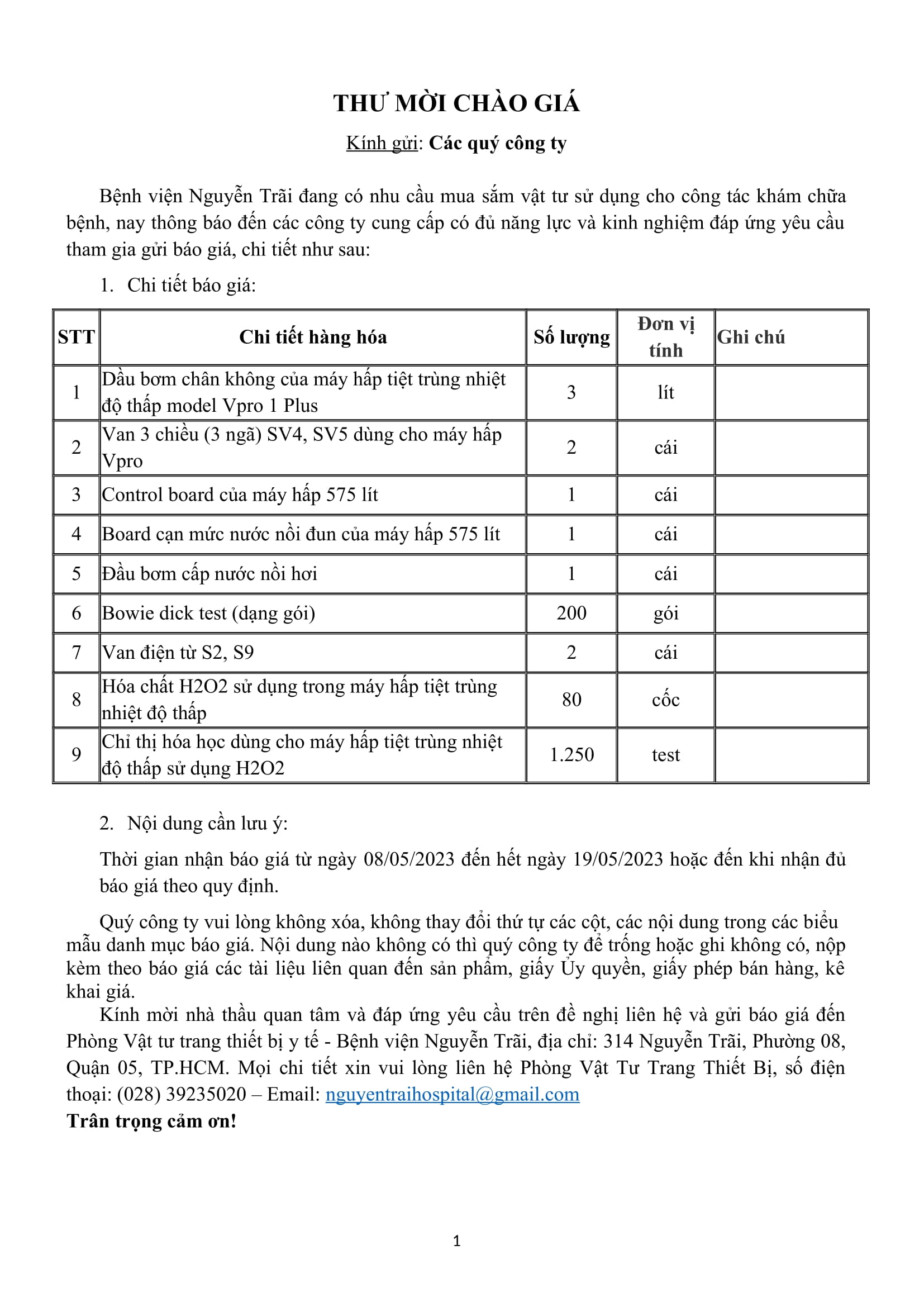 Thư mời chào giá bệnh viện Nguyễn Trãi đang có nhu cầu mua sắm vật tư sử dụng cho công tác khám chữa bệnh