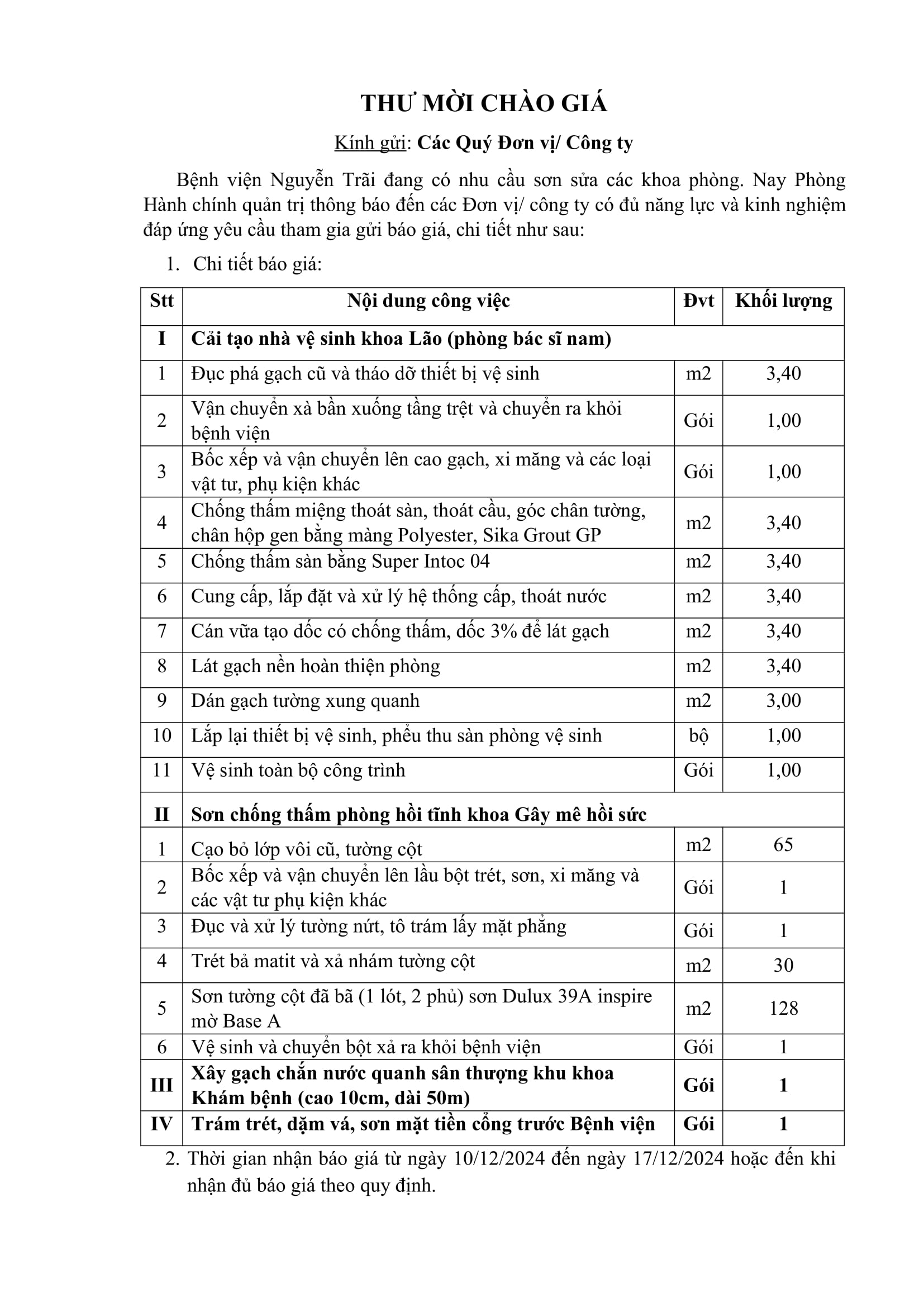 Thư mời chào giá Bệnh viện Nguyễn Trãi đang có nhu cầu sơn sửa các khoa phòng
