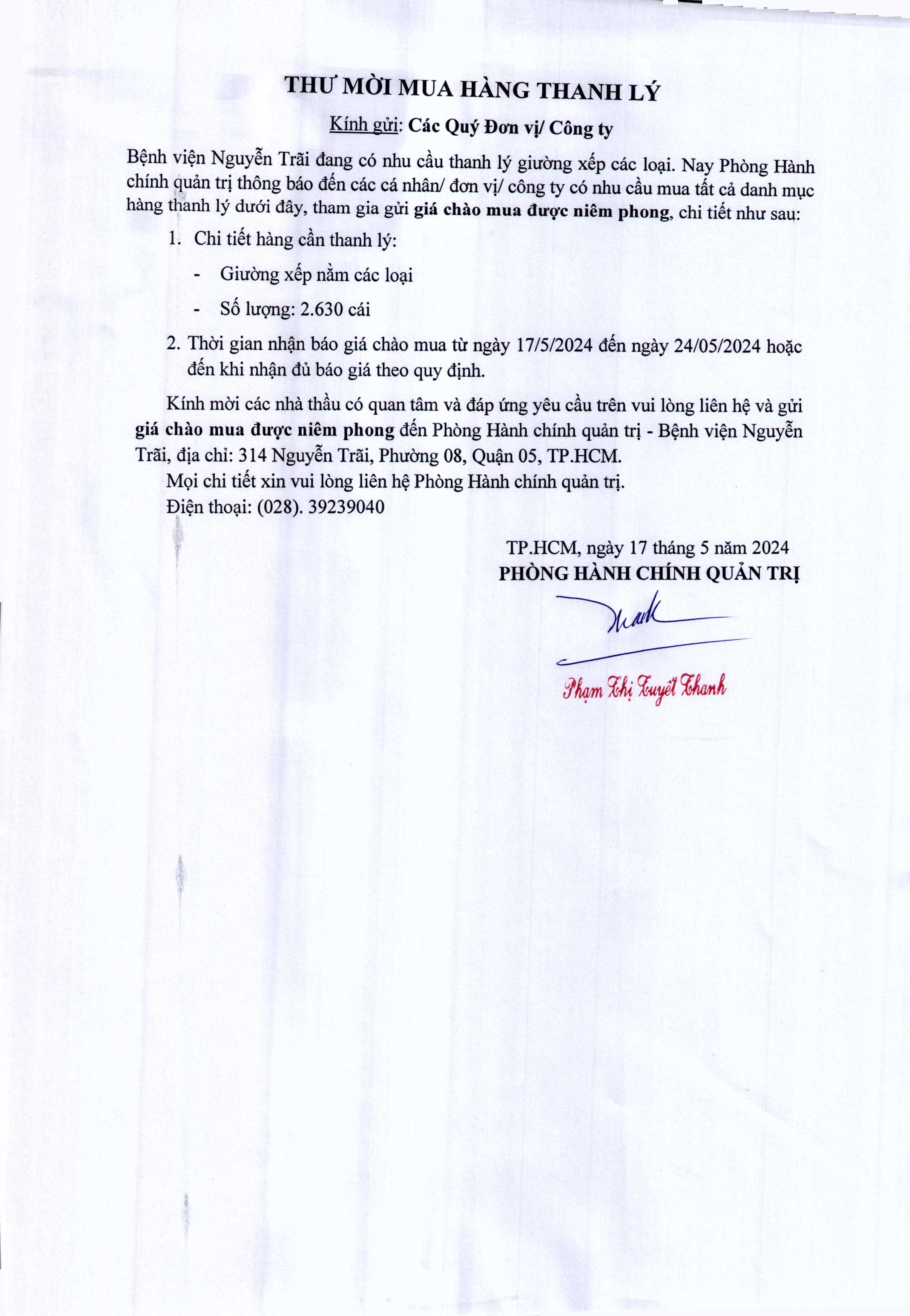 Thư mời chào giá Bệnh viện Nguyễn Trãi đang có nhu cầu thanh lý giường xếp các loại