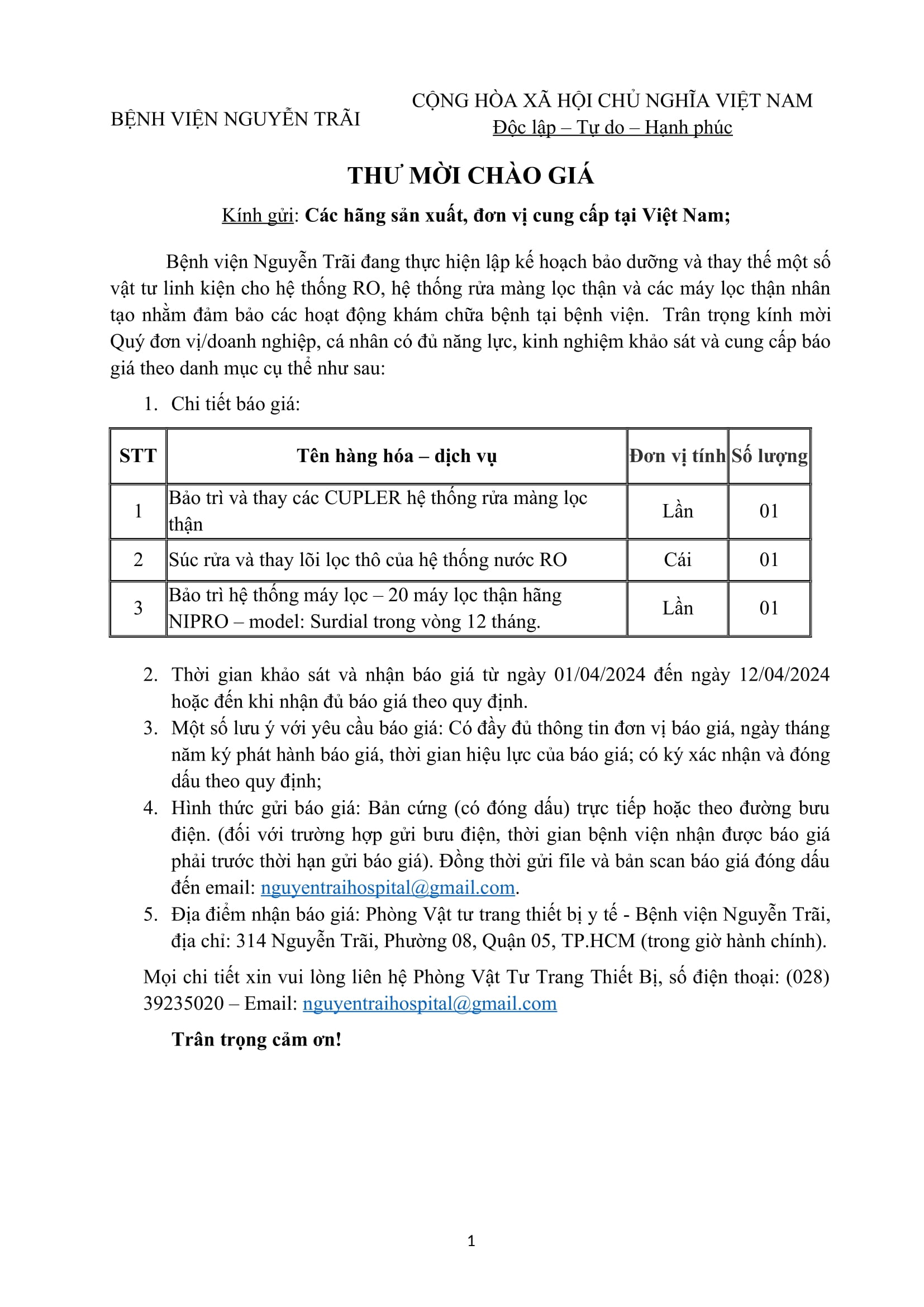 Thư mời chào giá Bệnh viện Nguyễn Trãi đang thực hiện lập kế hoạch bảo dưỡng và thay thế một số vật tư linh kiện cho hệ thống RO,hệ thống rửa màng lọc thận và các máy lọc thận nhân tạo nhằm đảm bảo các hoạt động khám chữa bệnh tại bệnh viện