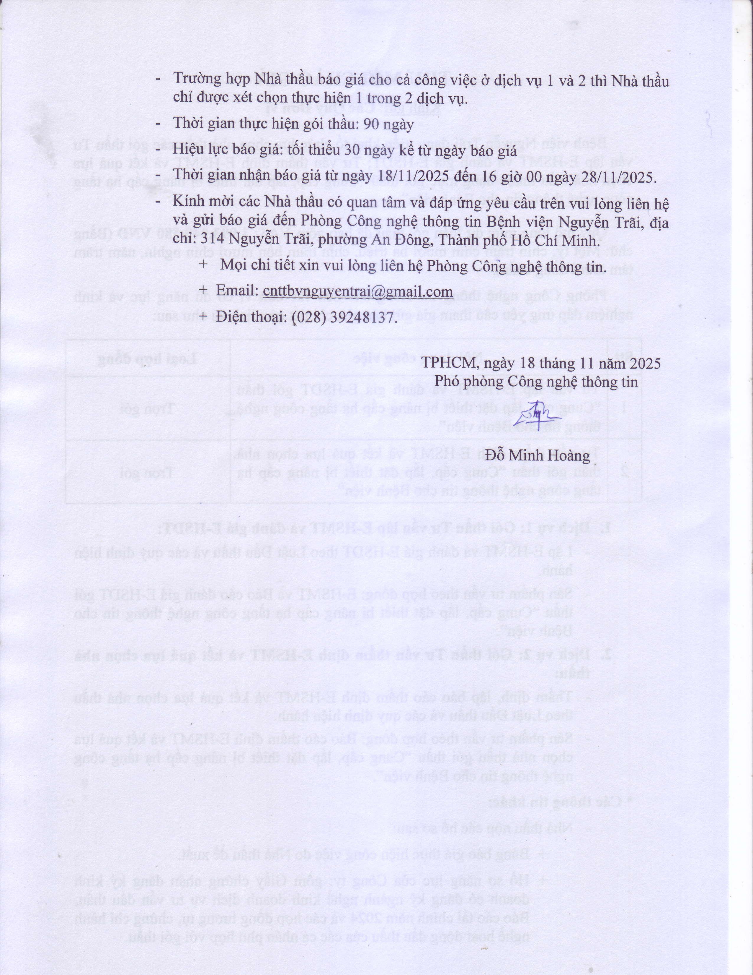 Thư mời chào giá Bệnh viện Nguyễn Trãi đang triển khai tổ chức lựa chọn nhà thầu các gói thầu tư vấn lập E-HSMT và đánh giá E-HSDT, tư vấn thẩm định E-HSMT và kết quả lựa chọn nhà thầu thuộc hạng mục gói thầu “Cung cấp, lắp đặt thiết bị nâng cấp hạ tầng c