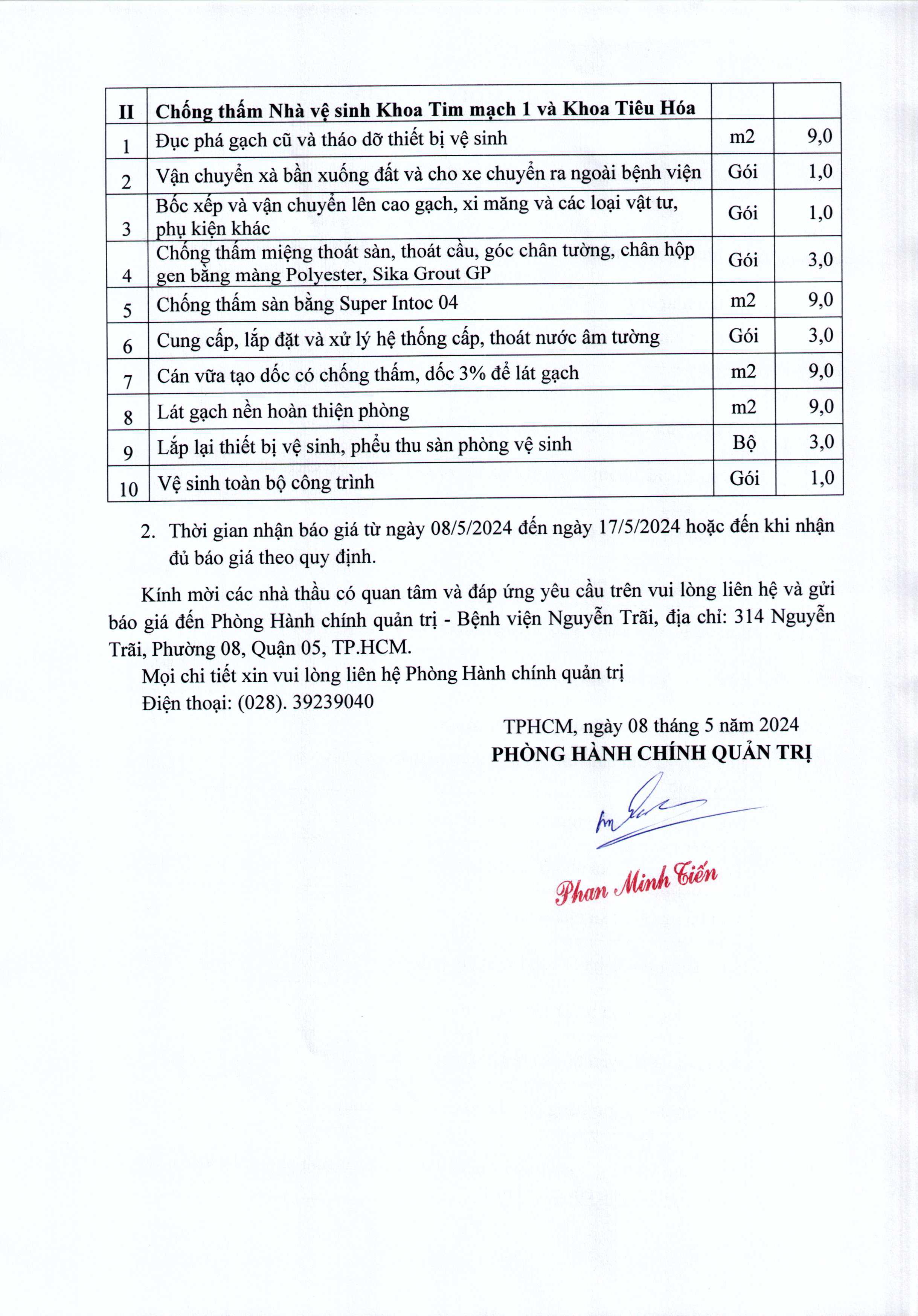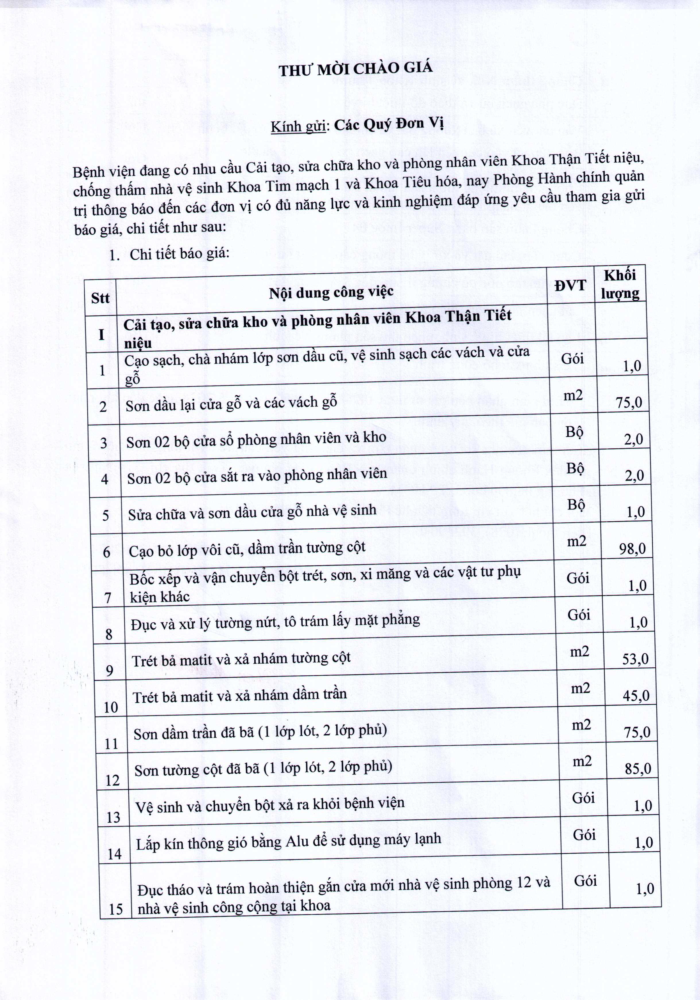 Thư mời chào giá cải tạo, sửa chữa kho và phòng nhân viên khoa Thận tiết niệu chống thấm nhà vệ sinh khoa Tim mạch 1 và khoa Tiêu hoá