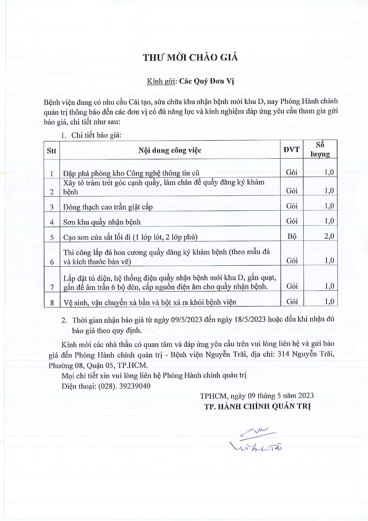 Thư mời chào giá cải tạo, sửa chữa khu nhận bệnh mới khu D
