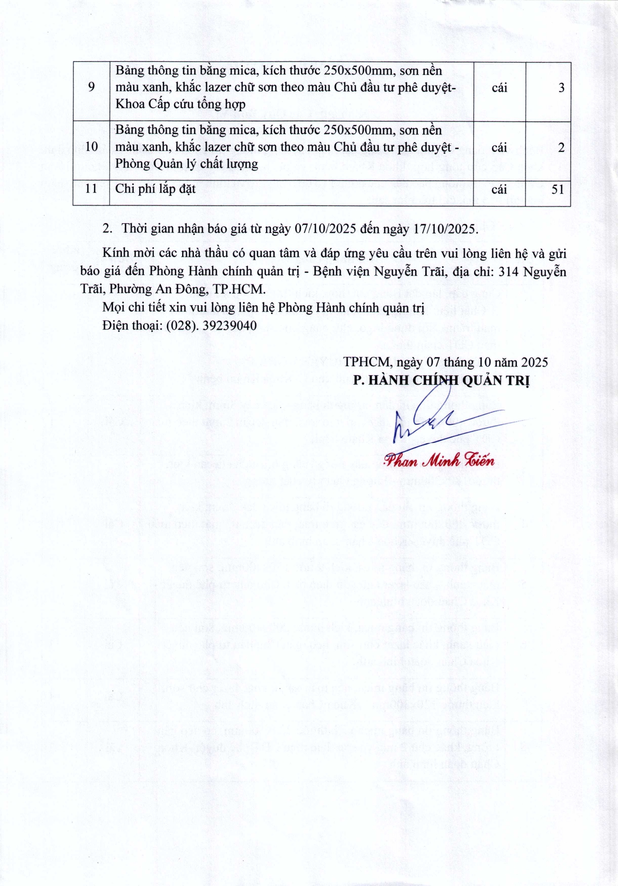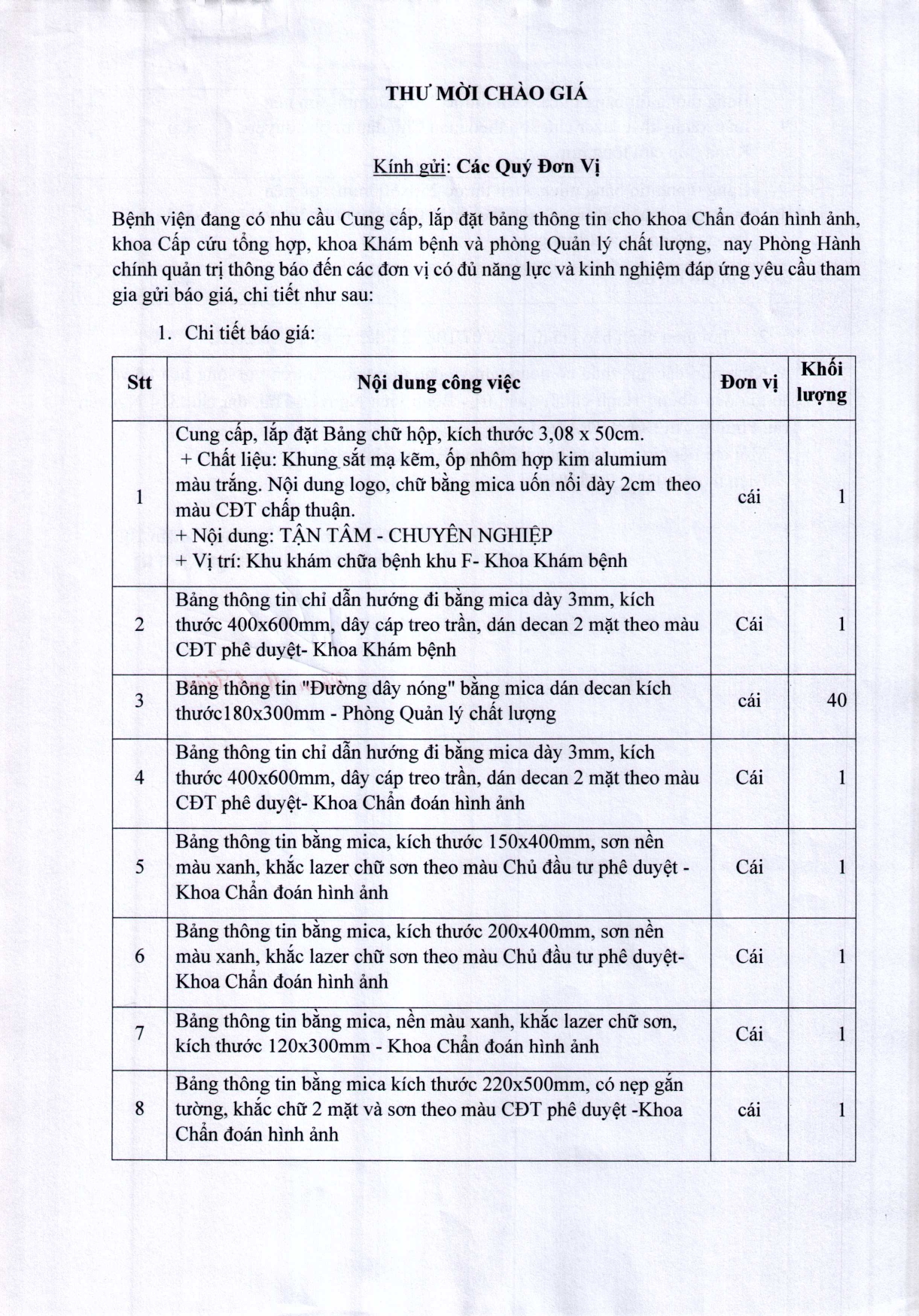 Thư mời chào giá Cung cấp, lắp đặt bảng thông tin cho khoa Chẩn đoán hình ảnh, khoa cấp cứu tổng hợp, khoa Khám bệnh và phòng Quản lý chất lượng