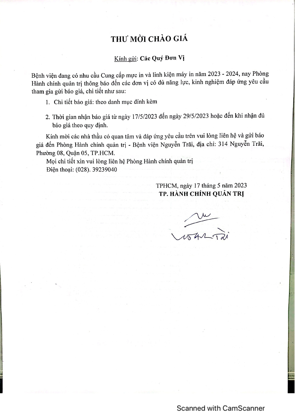Thư mời chào giá cung cấp mực in và linh kiện máy in năm 2023-2024
