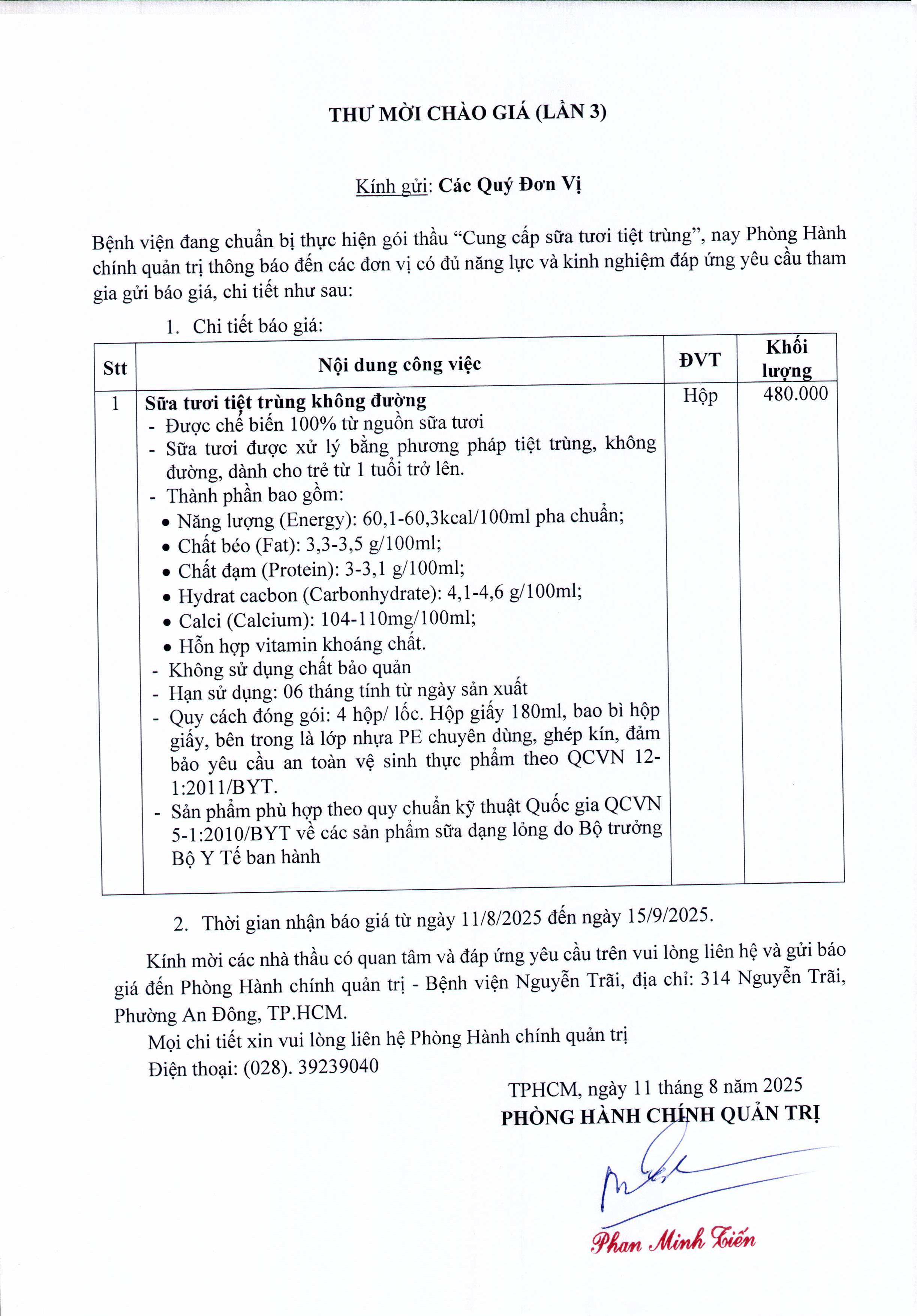 Thư mời chào giá “Cung cấp sữa tươi tiệt trùng “