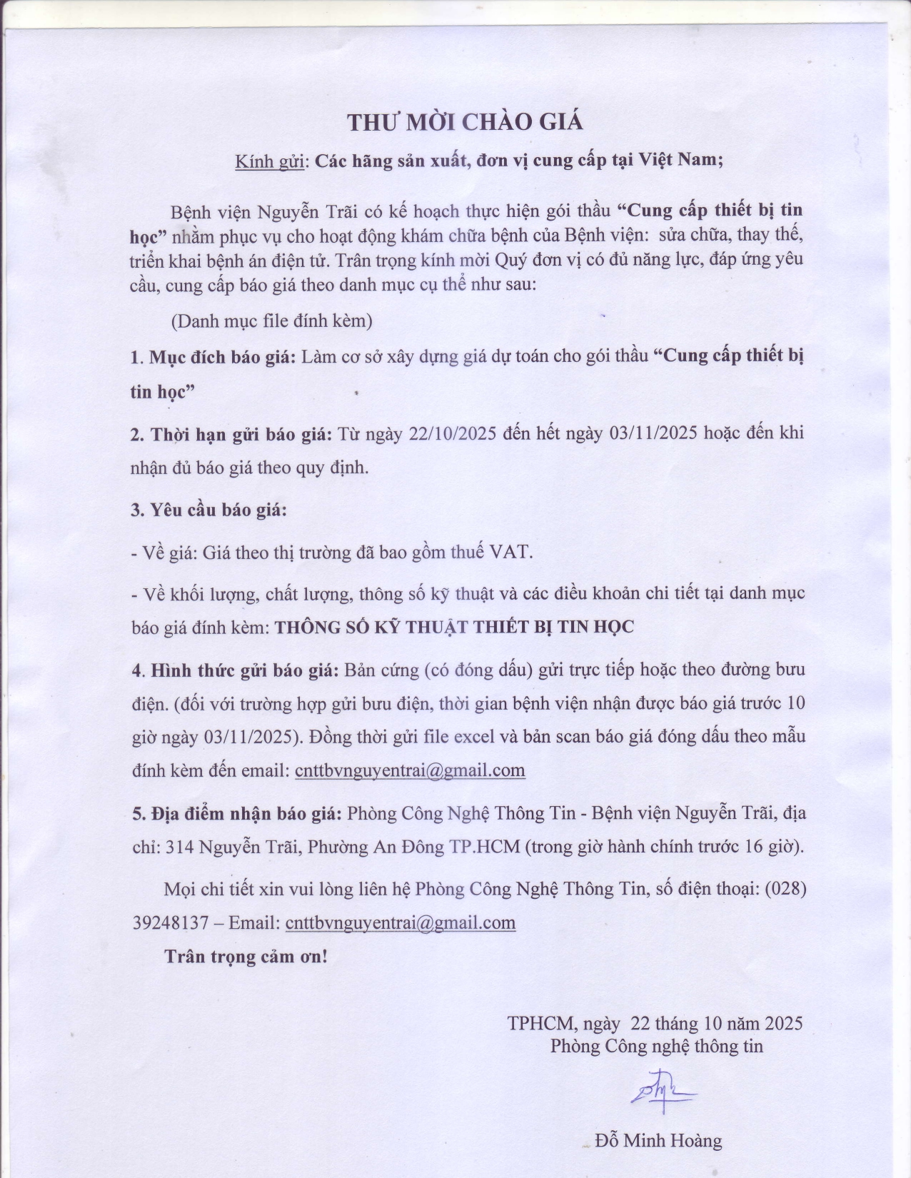 Thư mời chào giá Cung cấp thiết bị tin học