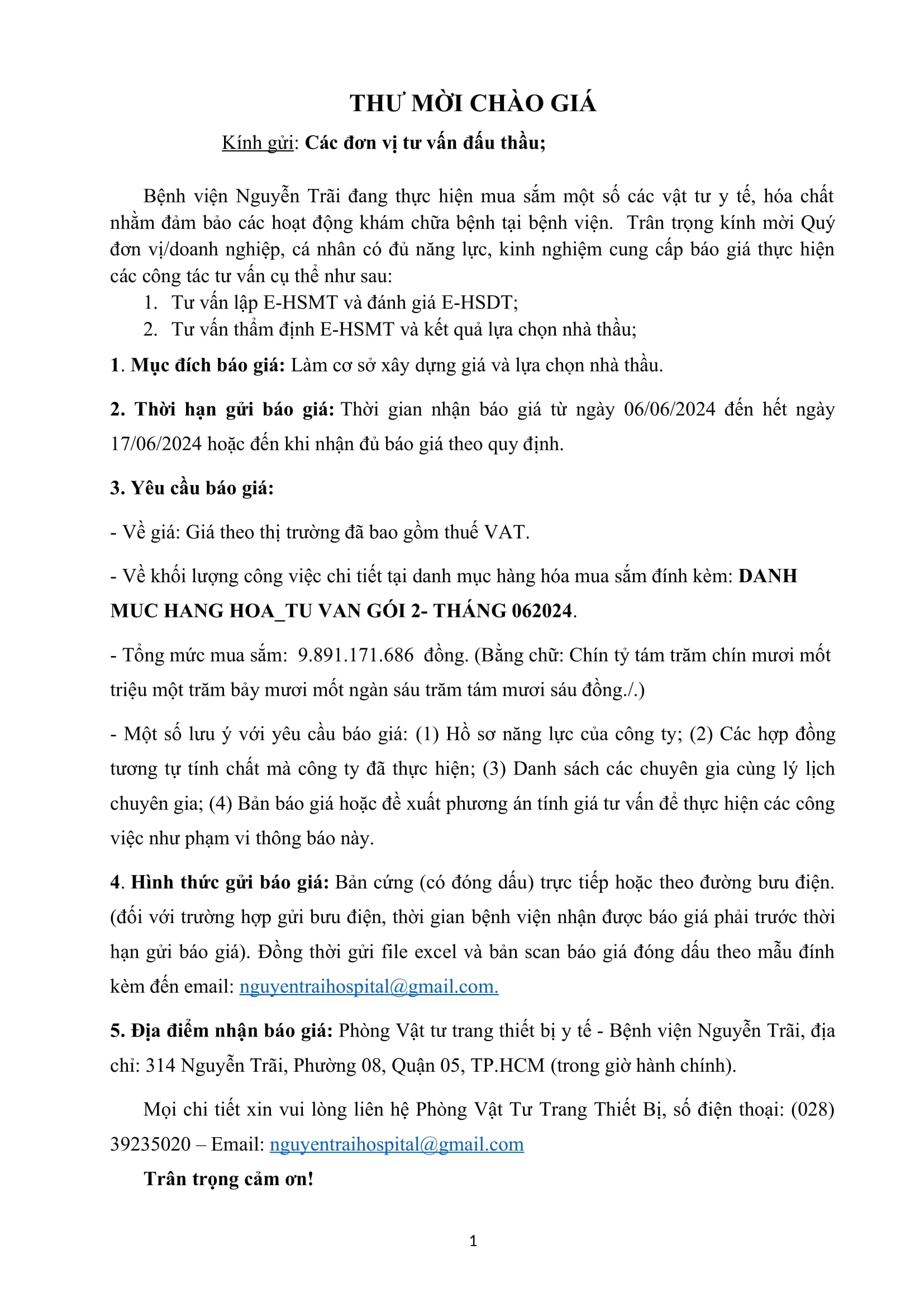 Thư mời chào giá dịch vụ tư vấn cho dự án mua sắm vật tư- hoá chất dùng trong chuyên khoa thận nhân tạo và giải phẫu bệnh lý của Bệnh viện Nguyễn Trãi năm 2024