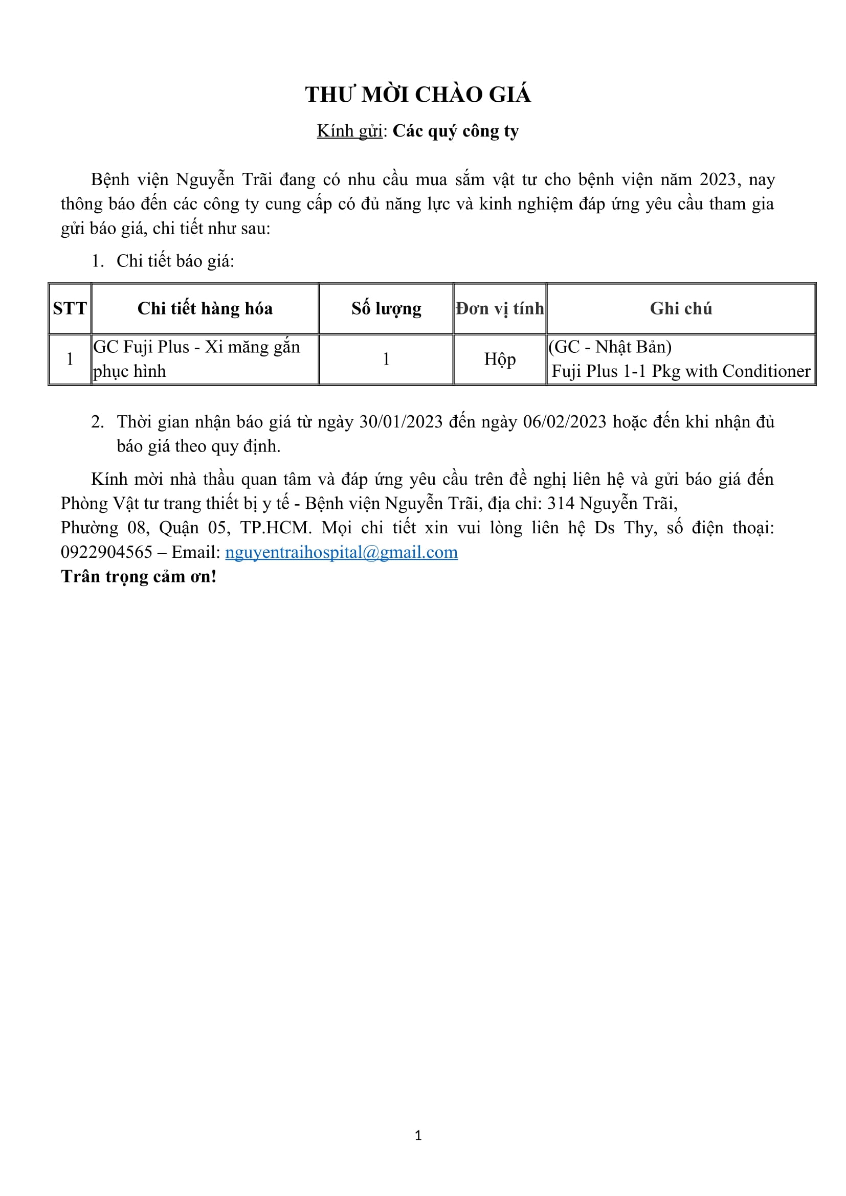 Thư mời chào giá GC Fuji Plus – Xi măng gắn phục hình