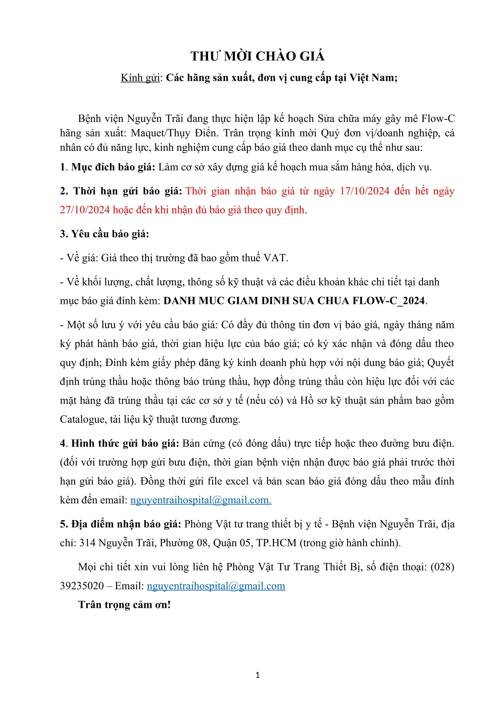 Thư mời chào giá gói thầu Giám định, sửa chữa lỗi của bình bốc hơi điện tử cho thuốc mê Servoflurane của máy gây mê Flow-C Maquet/Thụy Điển