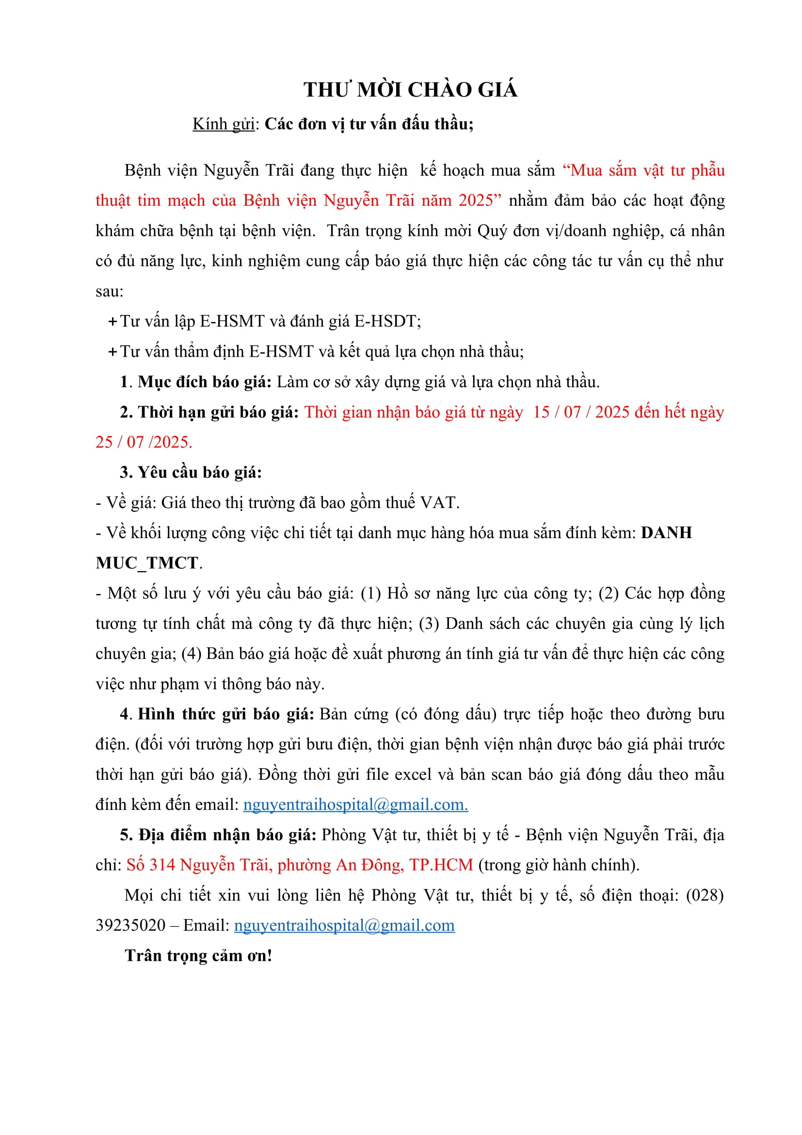 Thư mời chào giá gói thầu tư vấn cho kế hoạch mua sắm “Mua sắm vật tư phẫu thuật tim mạch của Bệnh viện Nguyễn Trãi năm 2025”