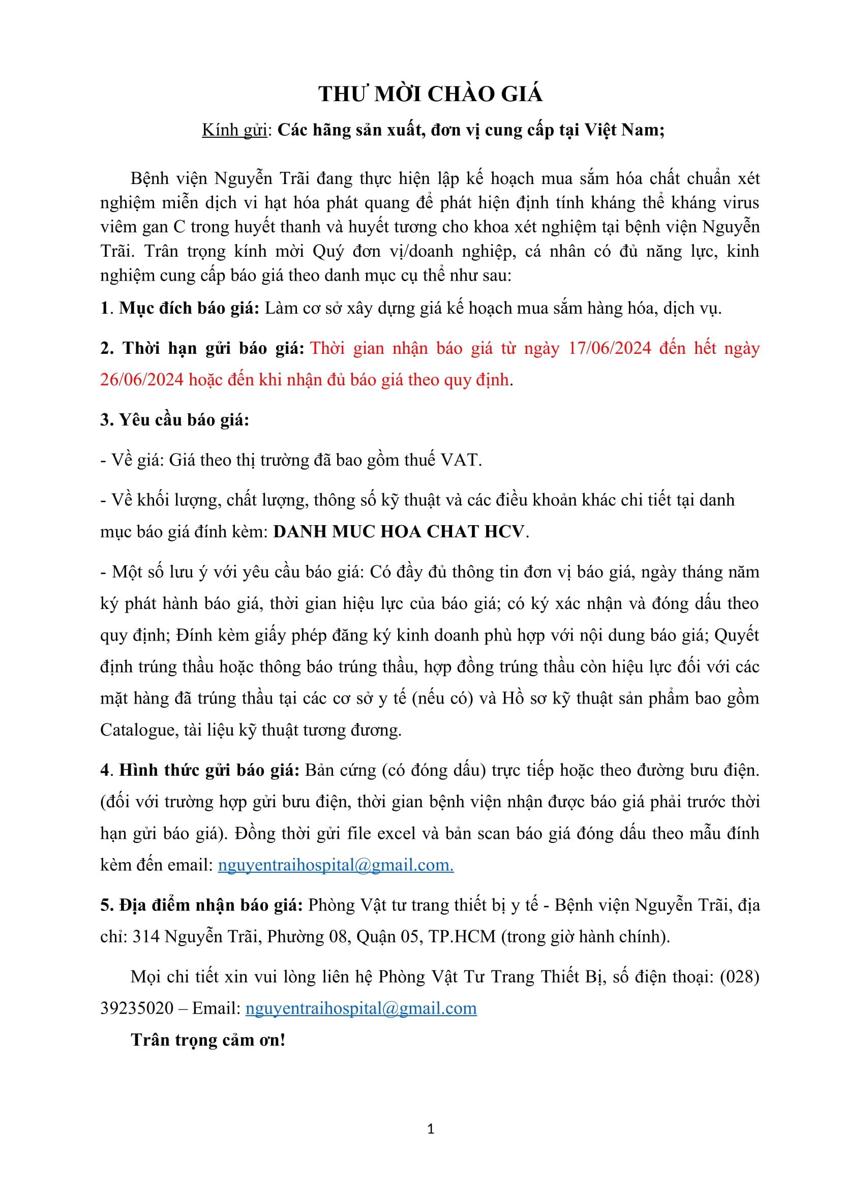 Thư mời chào giá hóa chất xét nghiệm định lượng kháng thể viêm gan C