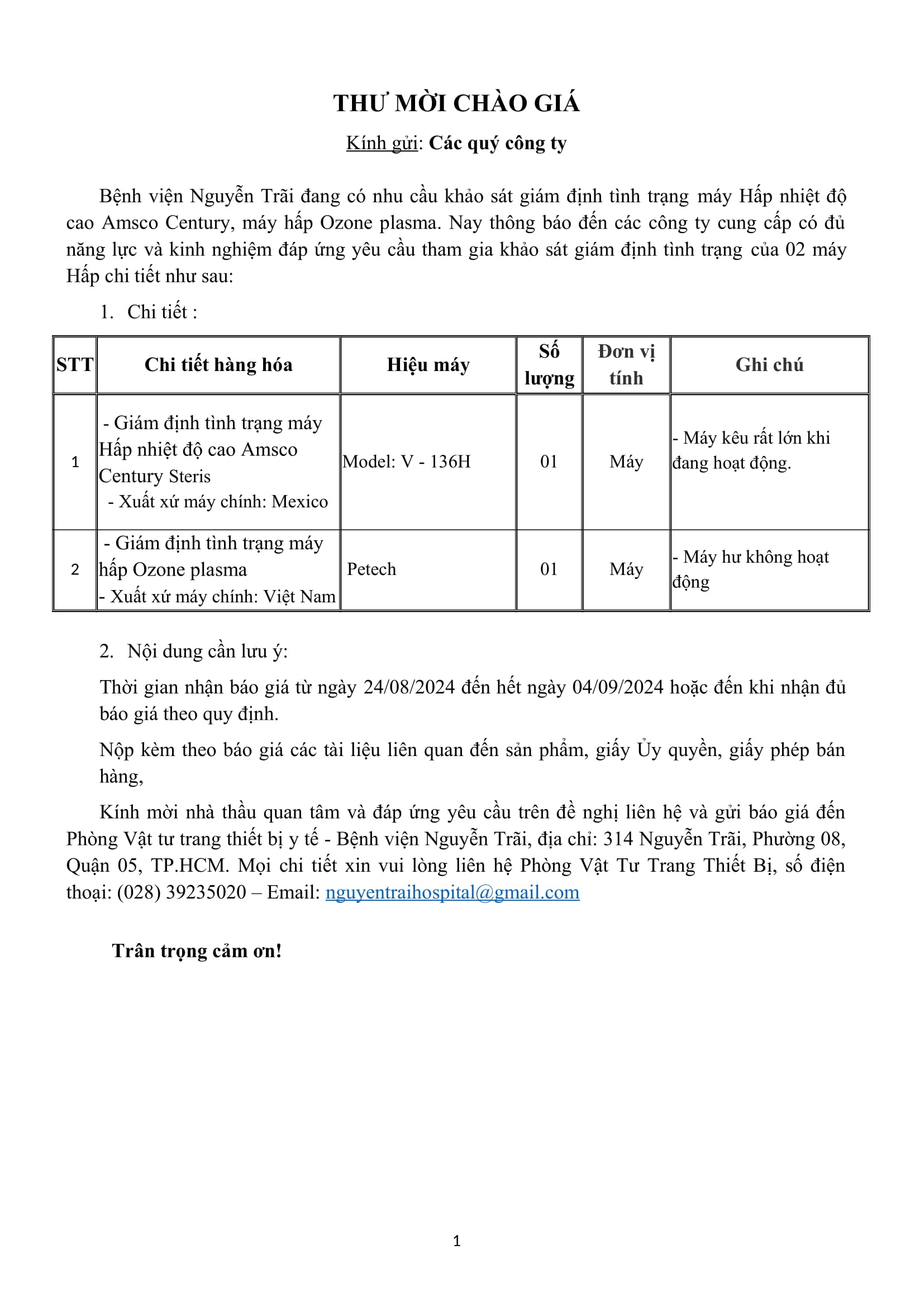 Thư mời chào giá khảo sát giám định tình trạng máy hấp nhiệt độ cao Amsco century, máy hấp Ozone plasma