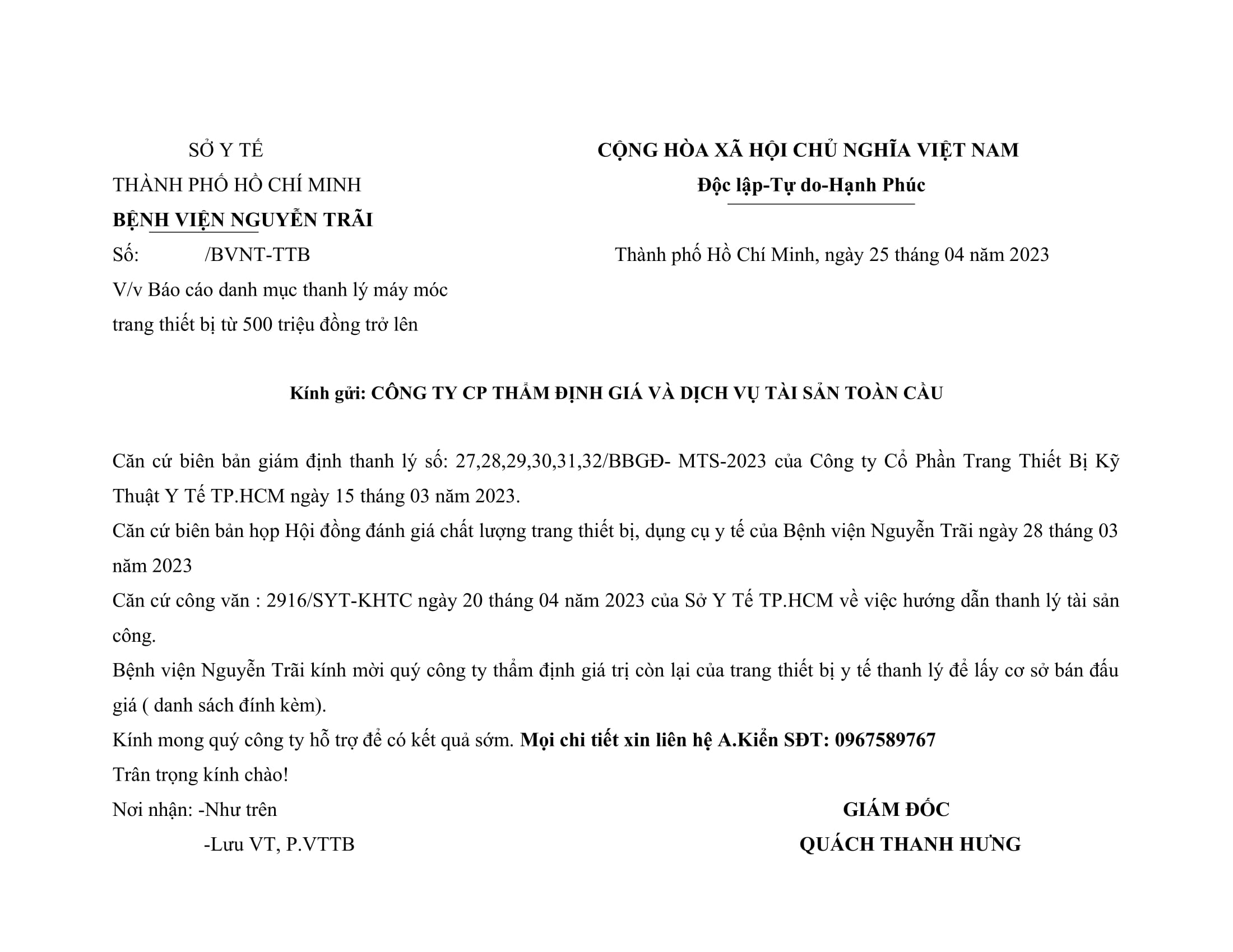 Thư mời chào giá mời đơn vị tham gia thẩm định giá tài sản thanh lý năm 2023
