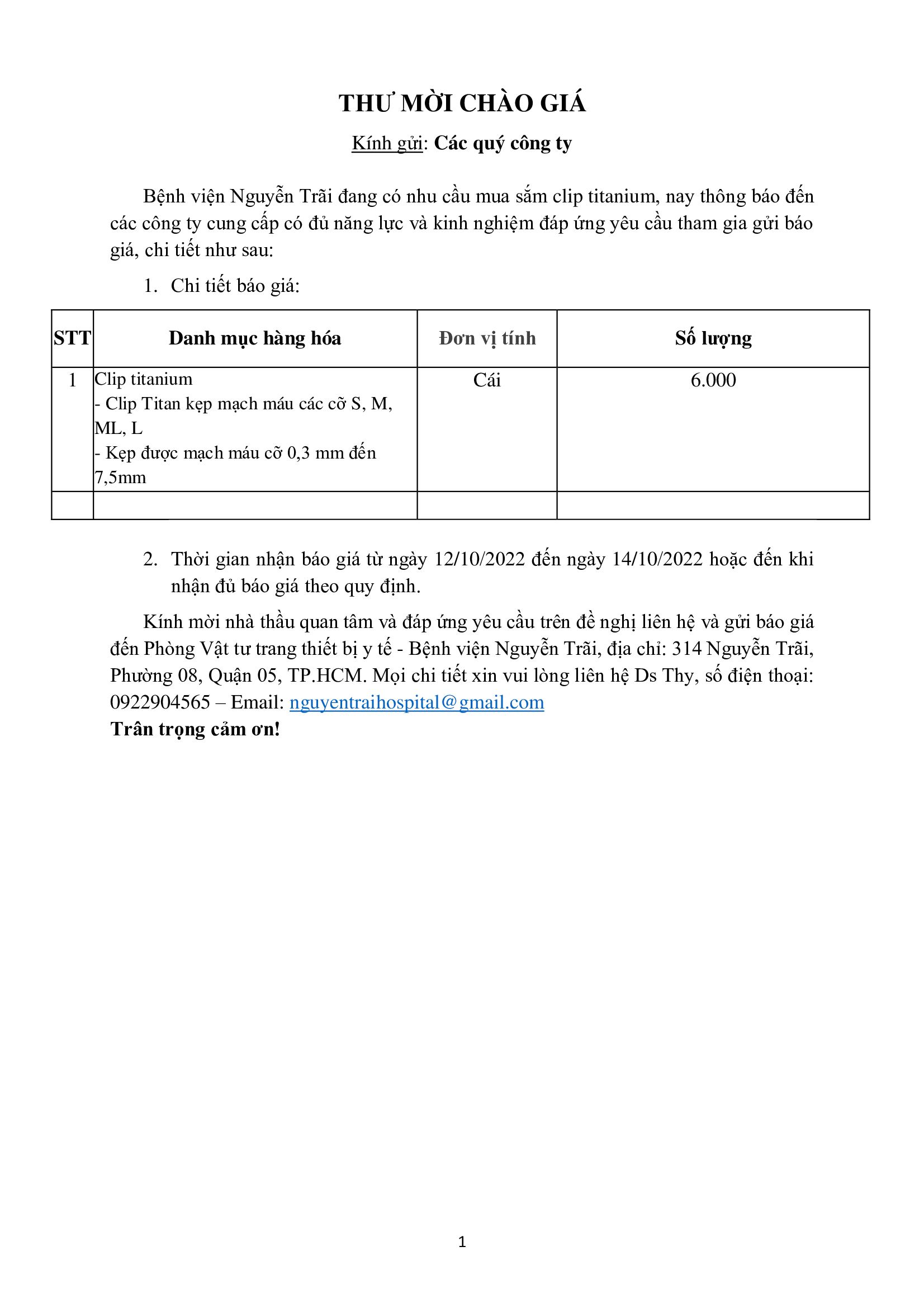 Thư mời chào giá mua sắm clip titanium