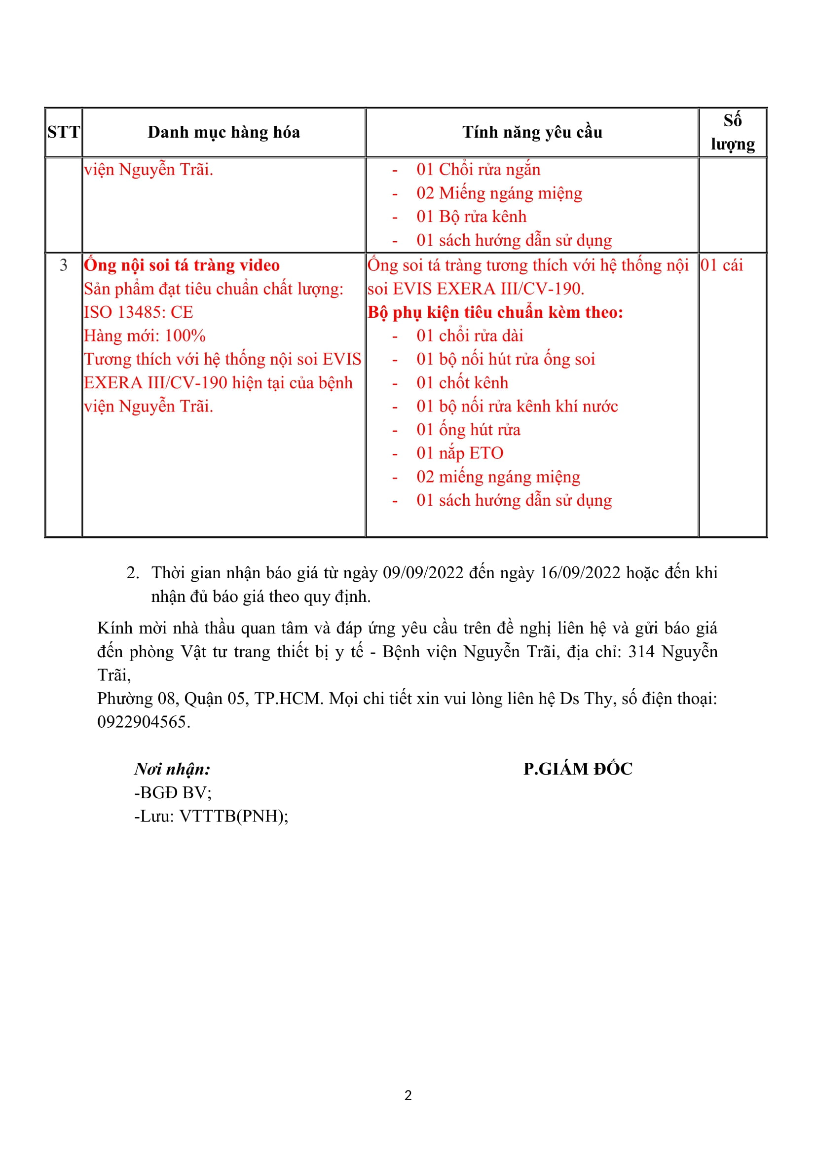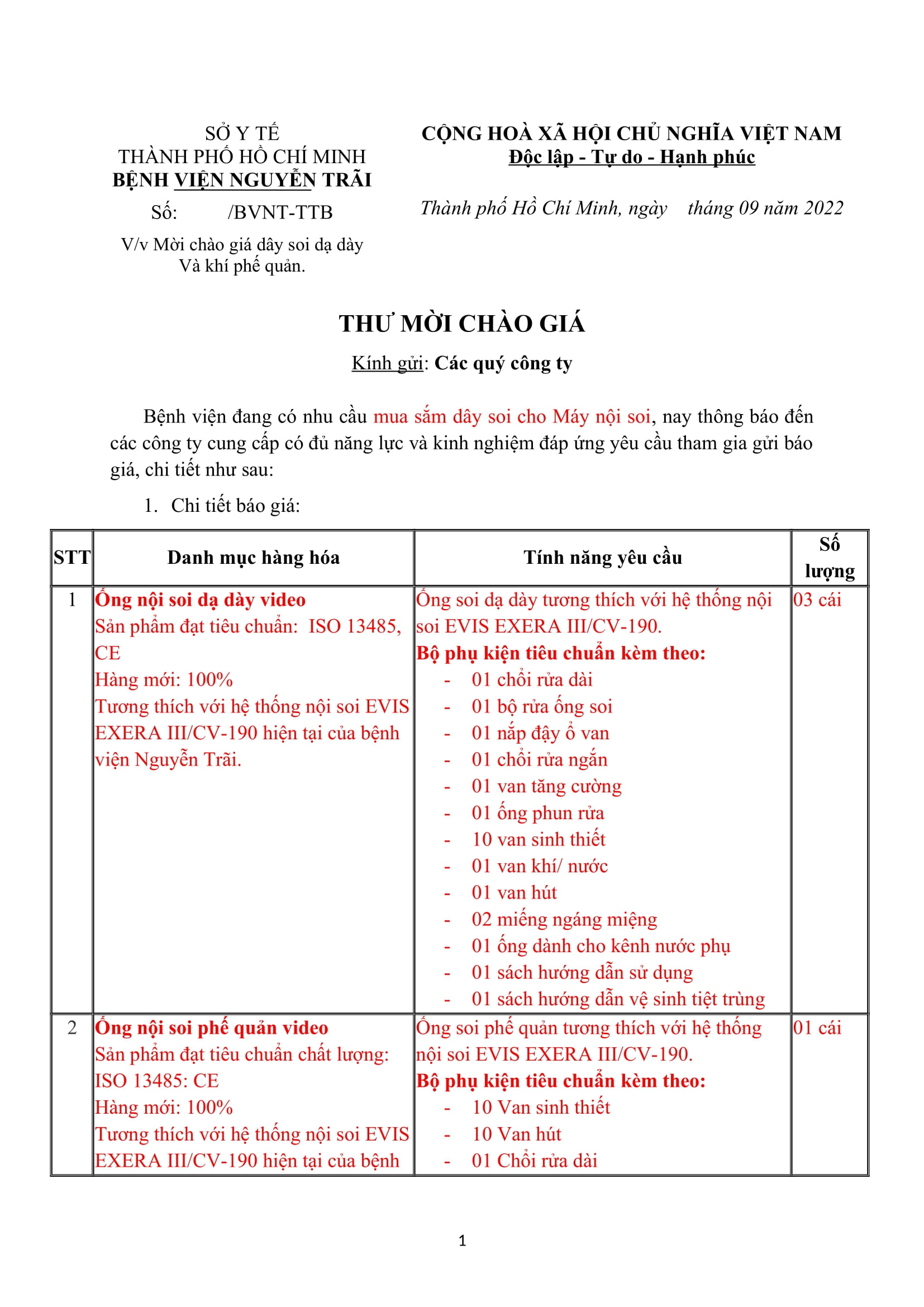 Thư mời chào giá mua sắm dây soi cho máy nội soi