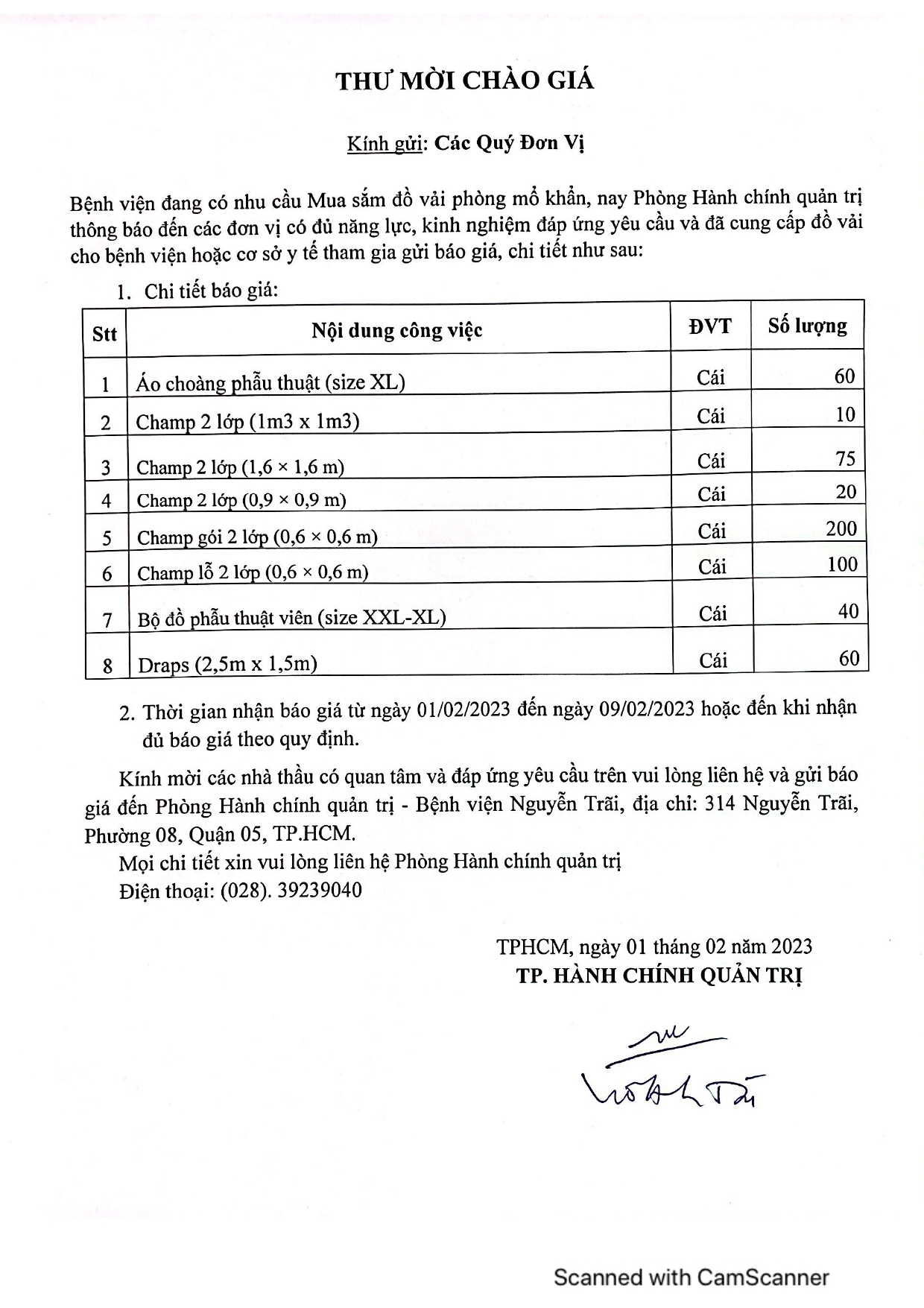 Thư mời chào giá mua sắm đồ vải phòng mổ khẩn