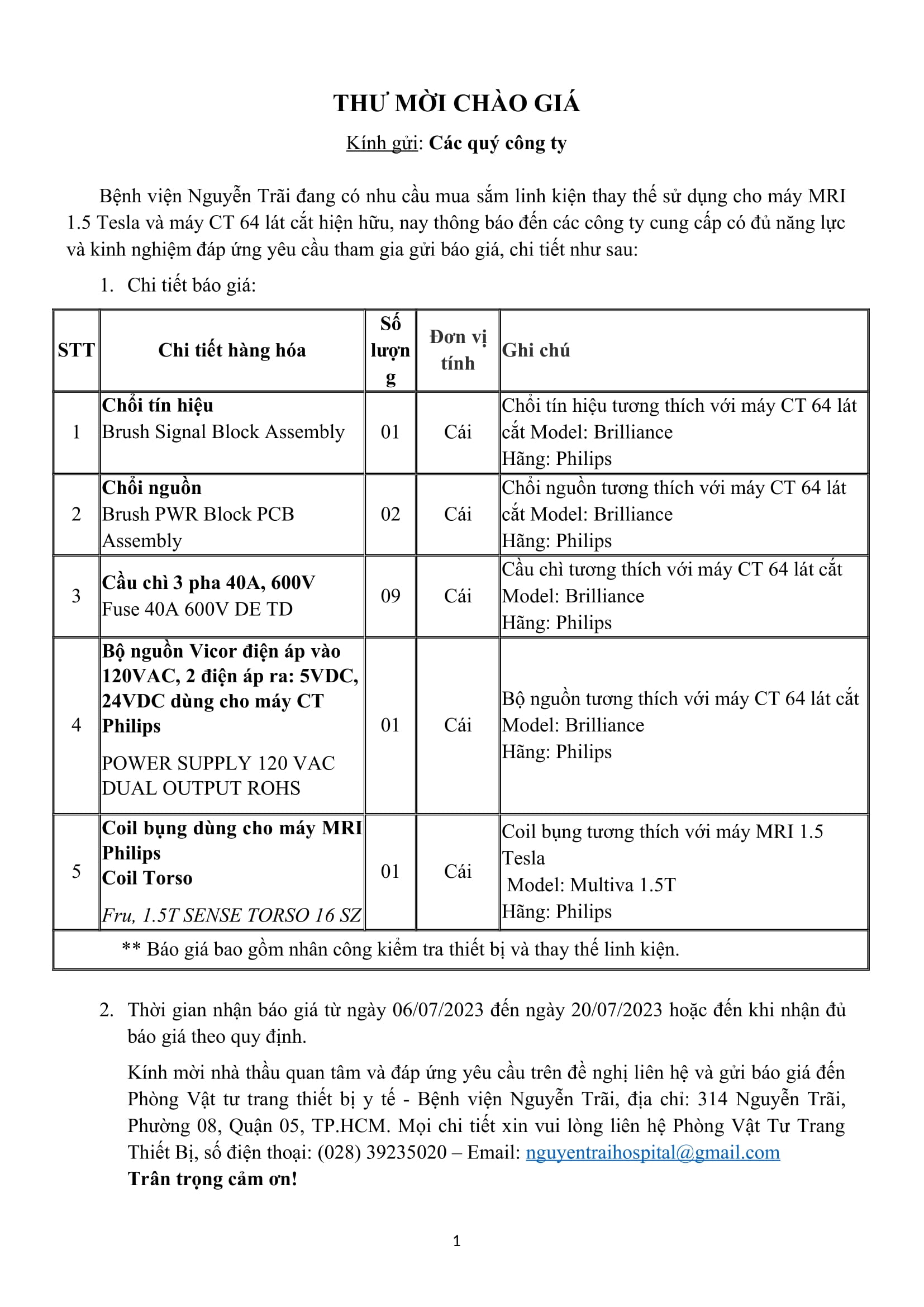 Thư mời chào giá mua sắm linh kiện thay thế sử dụng cho máy MRI 1.5 Tesla và máy CT 64 lát cắt hiện hữu