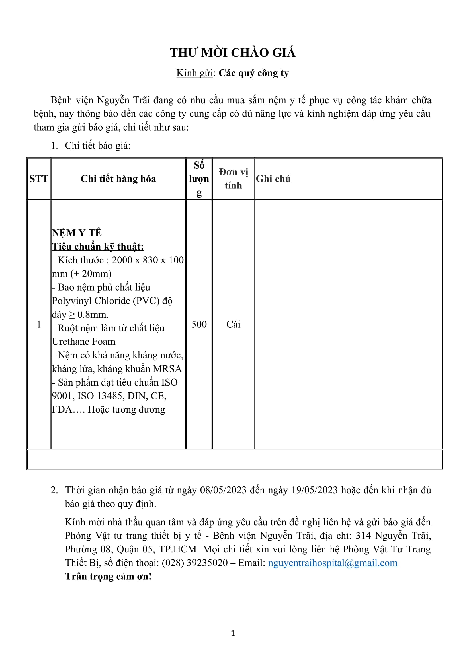 Thư mời chào giá mua sắm nệm y tế phục vụ công tác khám chữa bệnh