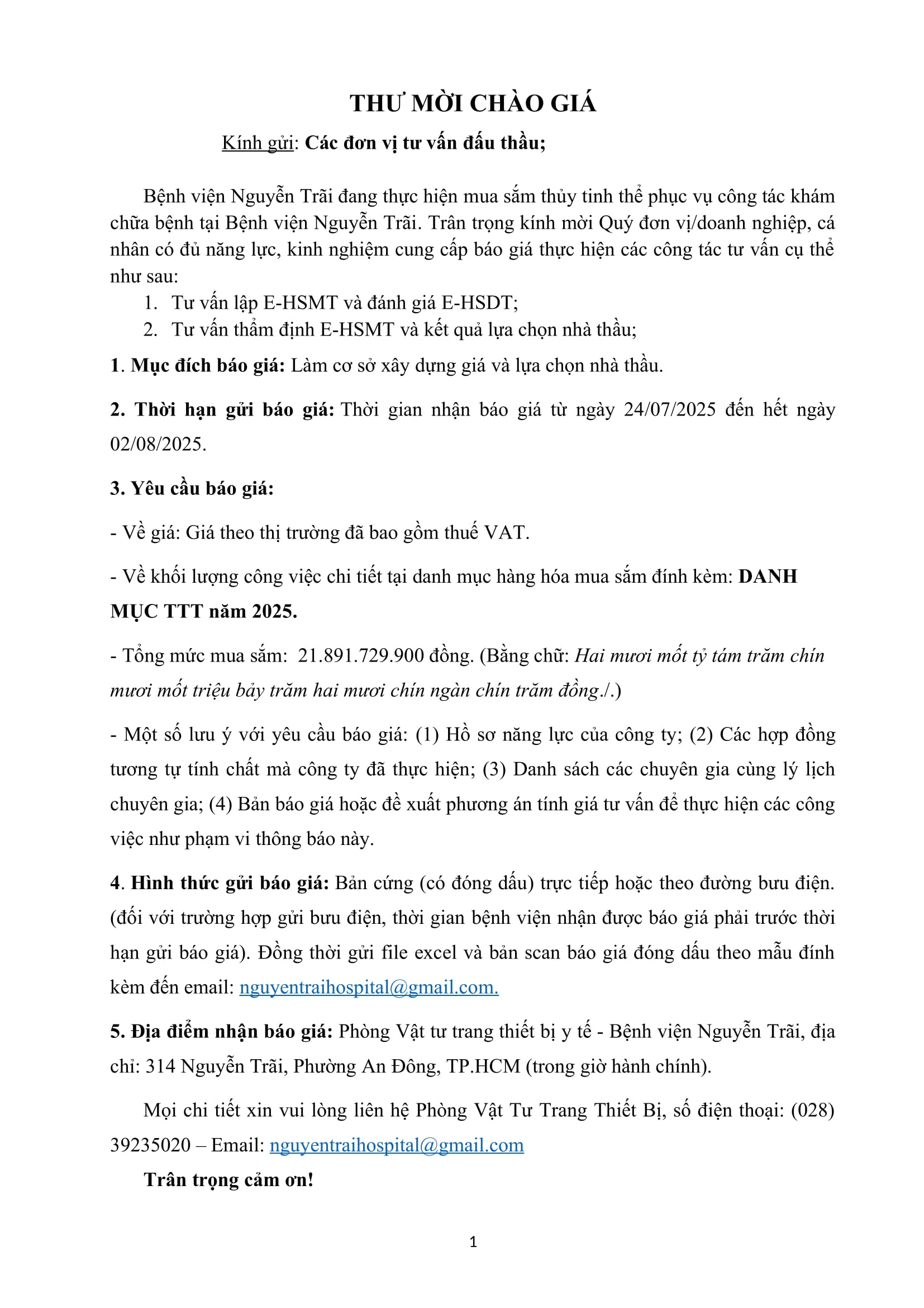 Thư mời chào giá Mua sắm thuỷ tinh thể