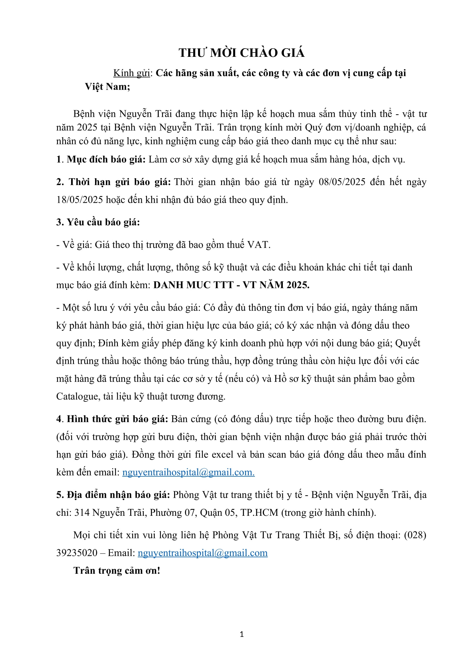 Thư mời chào giá mua sắm thuỷ tinh thể- vật tư năm 2025
