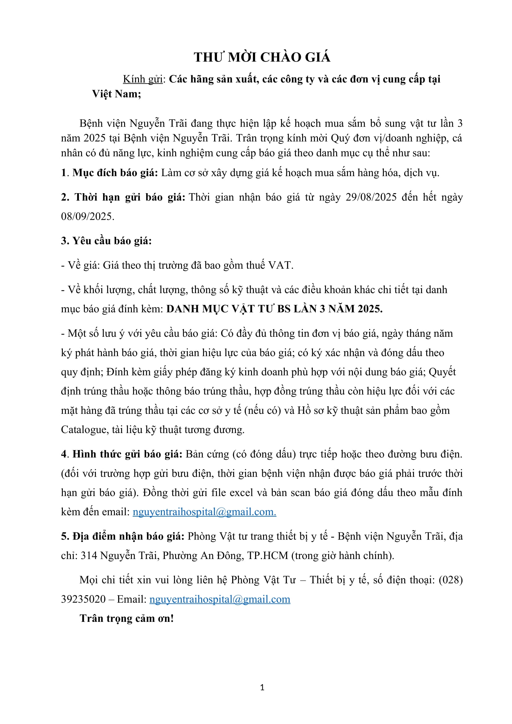 Thư mời chào giá mua sắm vật tư bổ sung lần 3 năm 2025