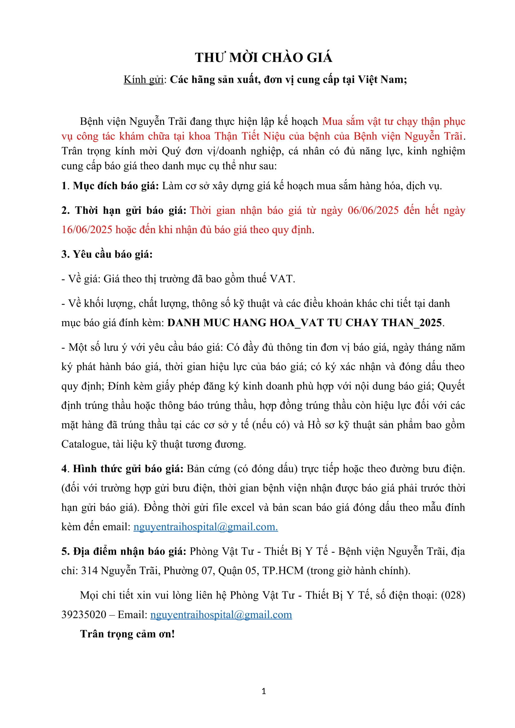 Thư mời chào giá mua sắm vật tư chạy thận phục vụ công tác khám chữa bệnh