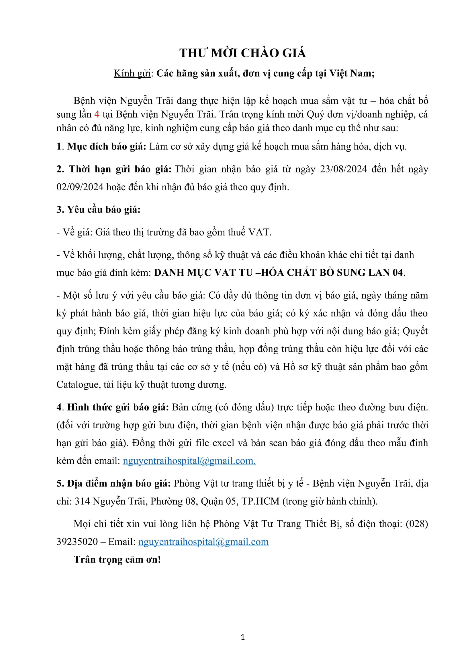 Thư mời chào giá mua sắm vật tư – hoá chất bổ sung lần 4