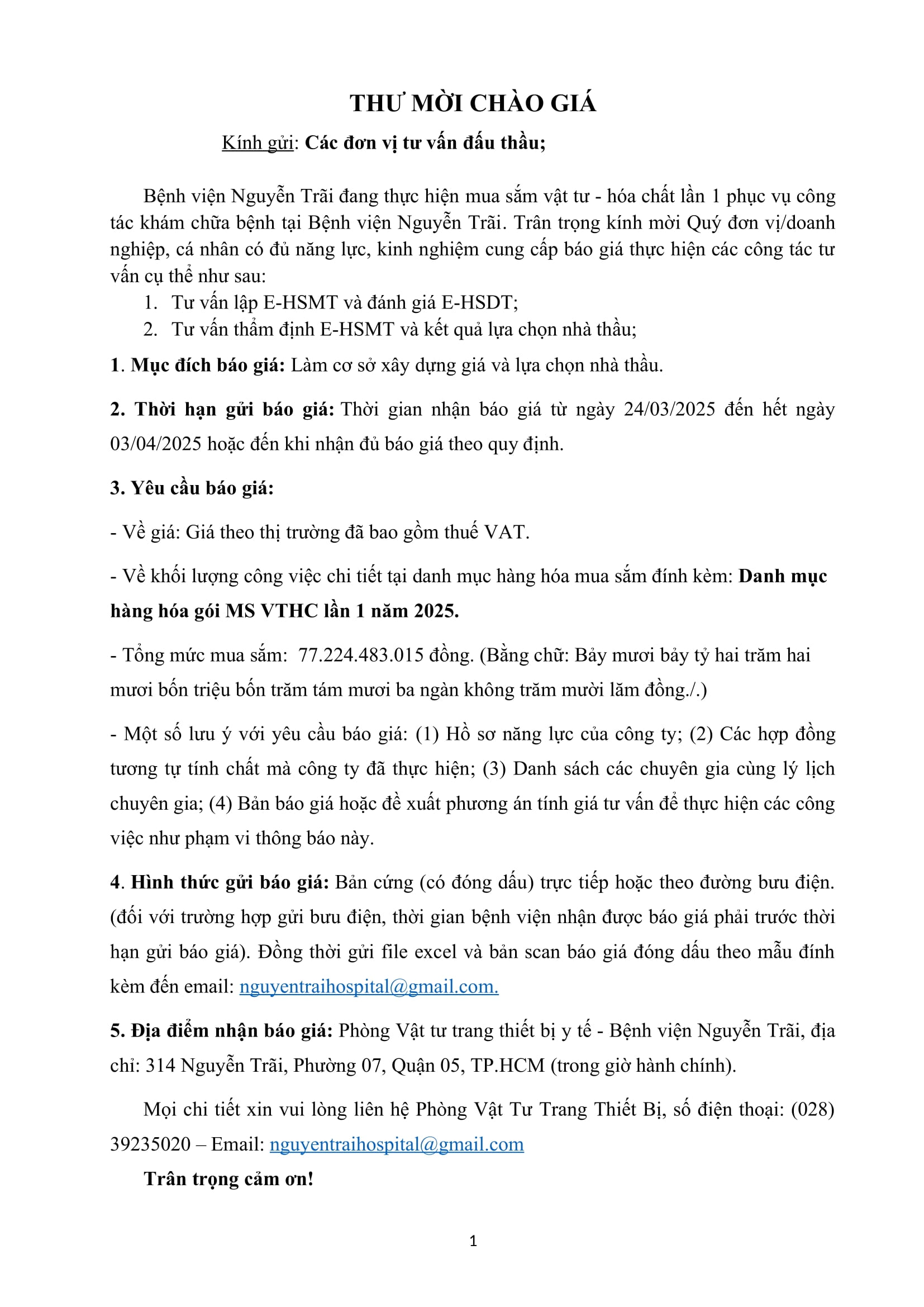 Thư mời chào giá Mua sắm vật tư hoá chất lần 1 năm 2025