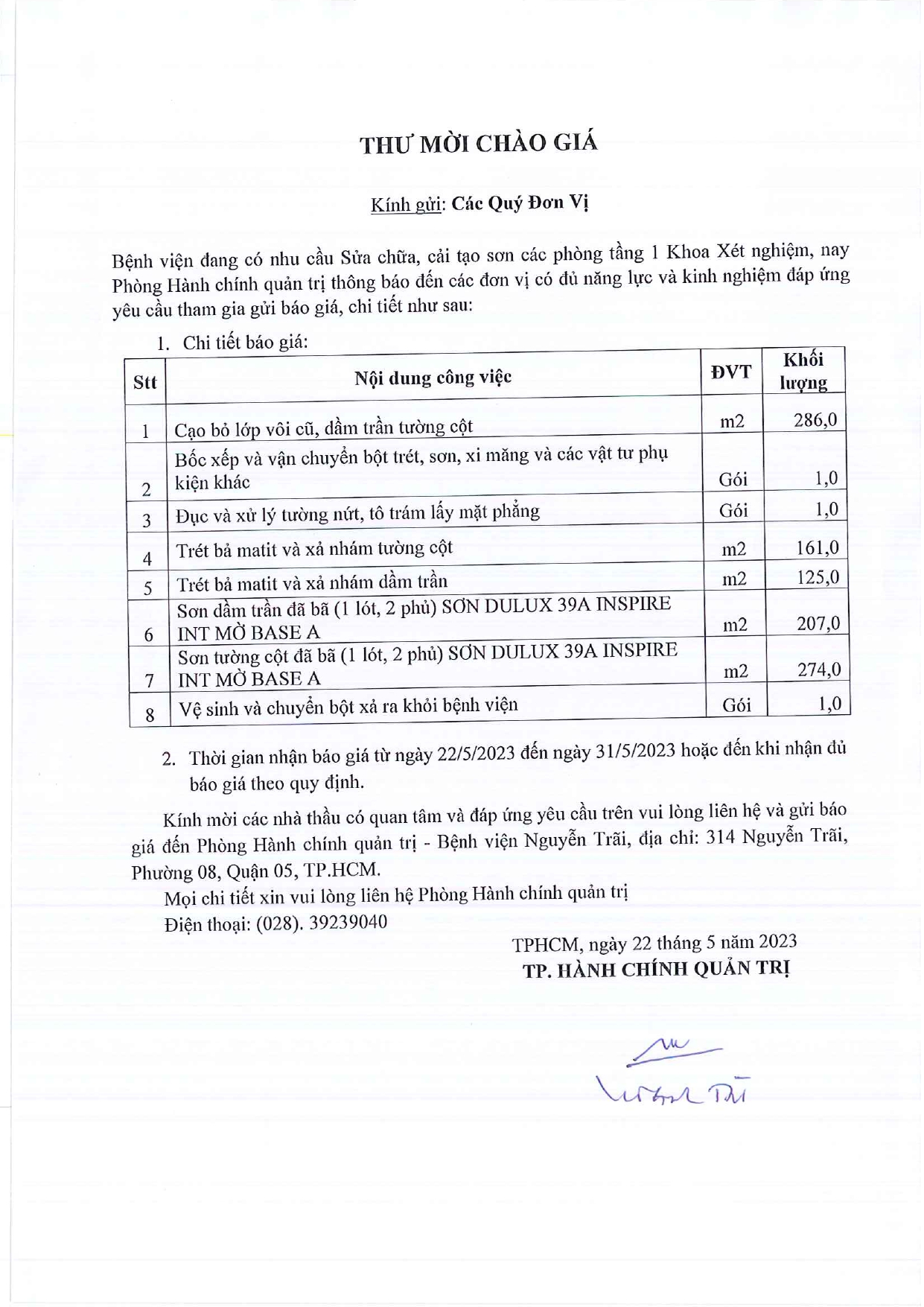 Thư mời chào giá sữa chữa, cải tạo sơn các phòng tầng 1 khoa Xét Nghiệm
