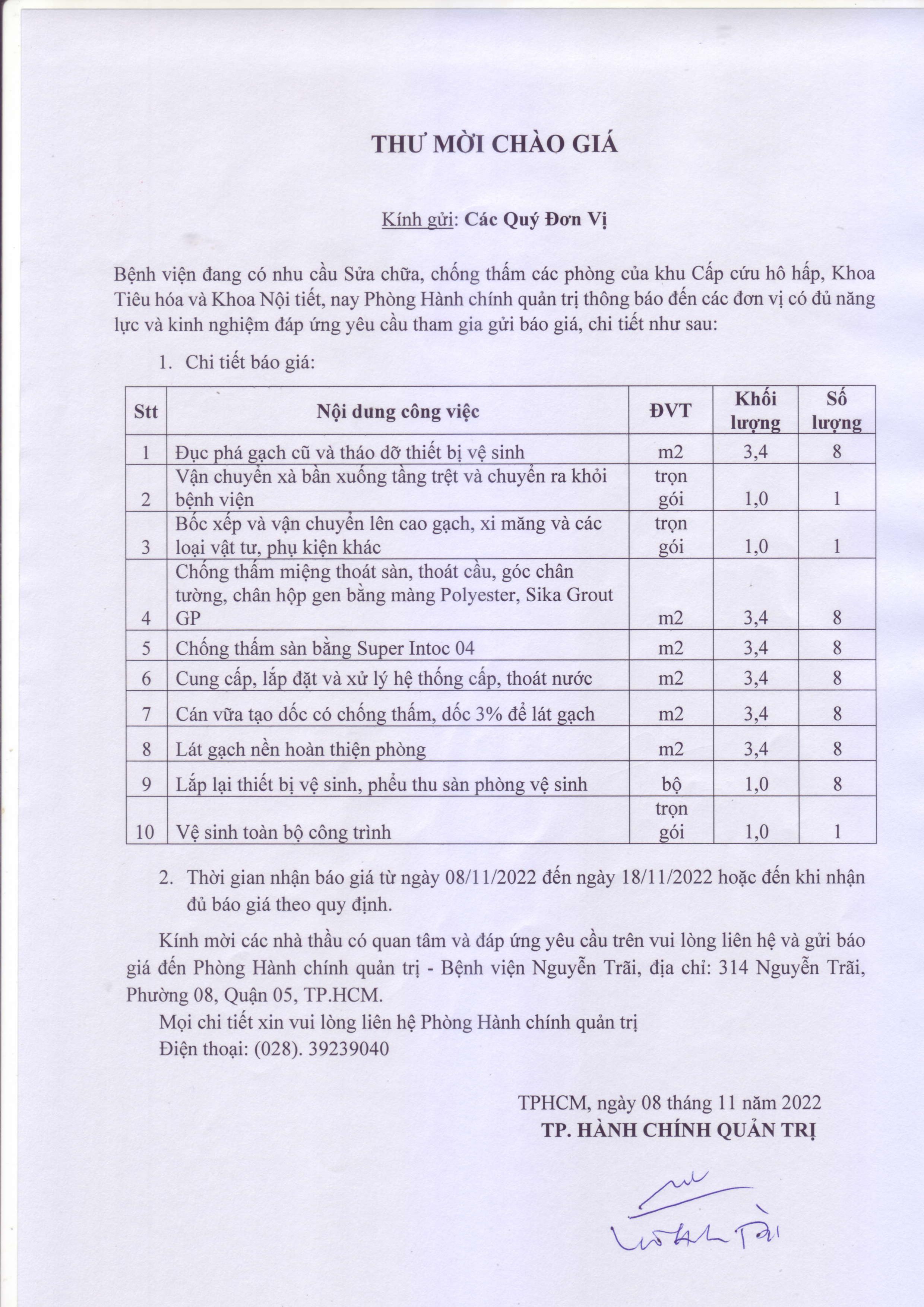 Thư mời chào giá sữa chữa chống thấm các phòng khu cấp cứu Hô hấp,khoa Tiếu hóa,khoa Nội tiết