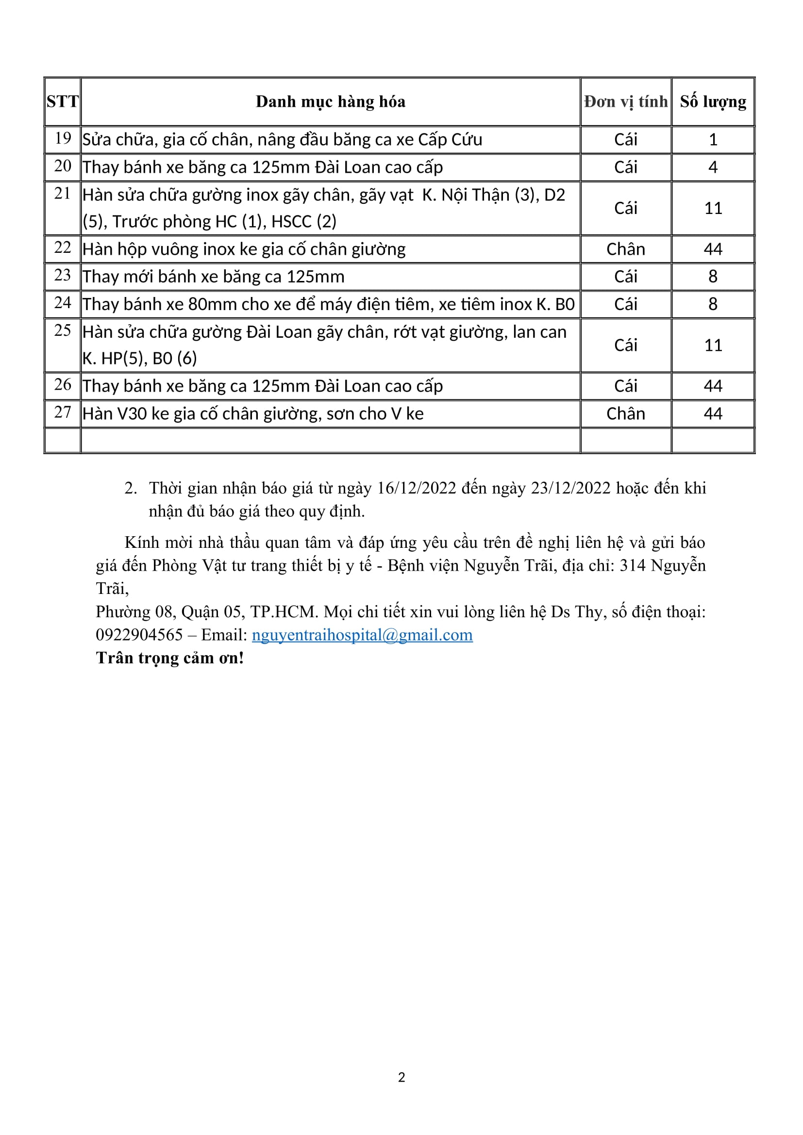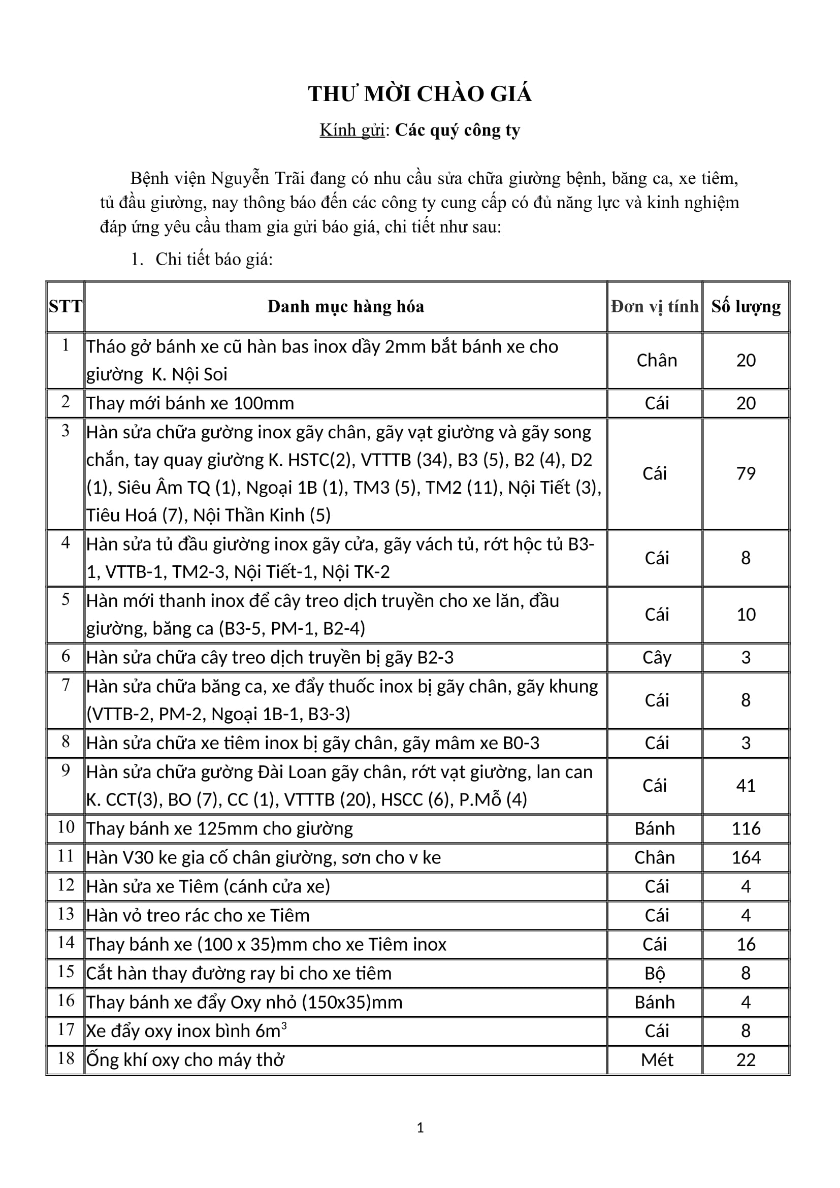 Thư mời chào giá sửa chữa giường bệnh,băng ca, xe tiêm,tủ đầu giường