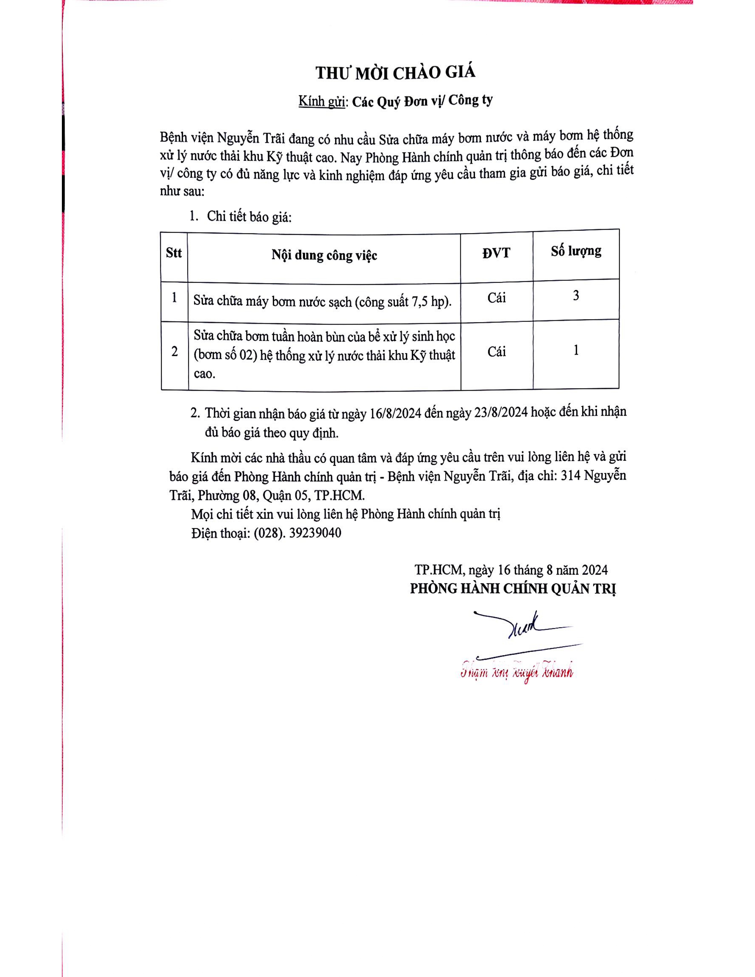 Thư mời chào giá sửa chữa máy bơm nước và máy bơm hệ thống xử lý nước thải khu kỹ thuật cao