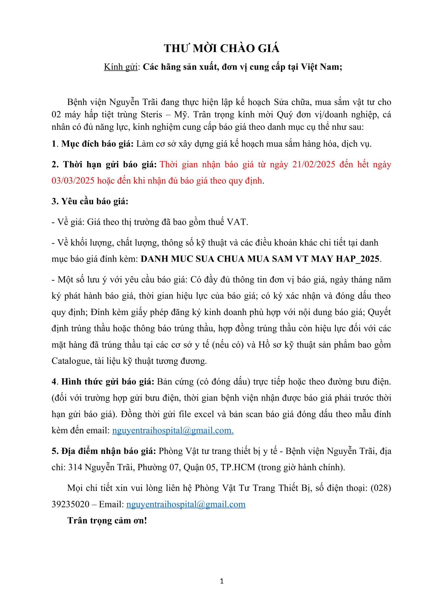 Thư mời chào giá Sửa chữa, mua sắm vật tư cho 02 máy hấp tiệt trùng Steris-Mỹ
