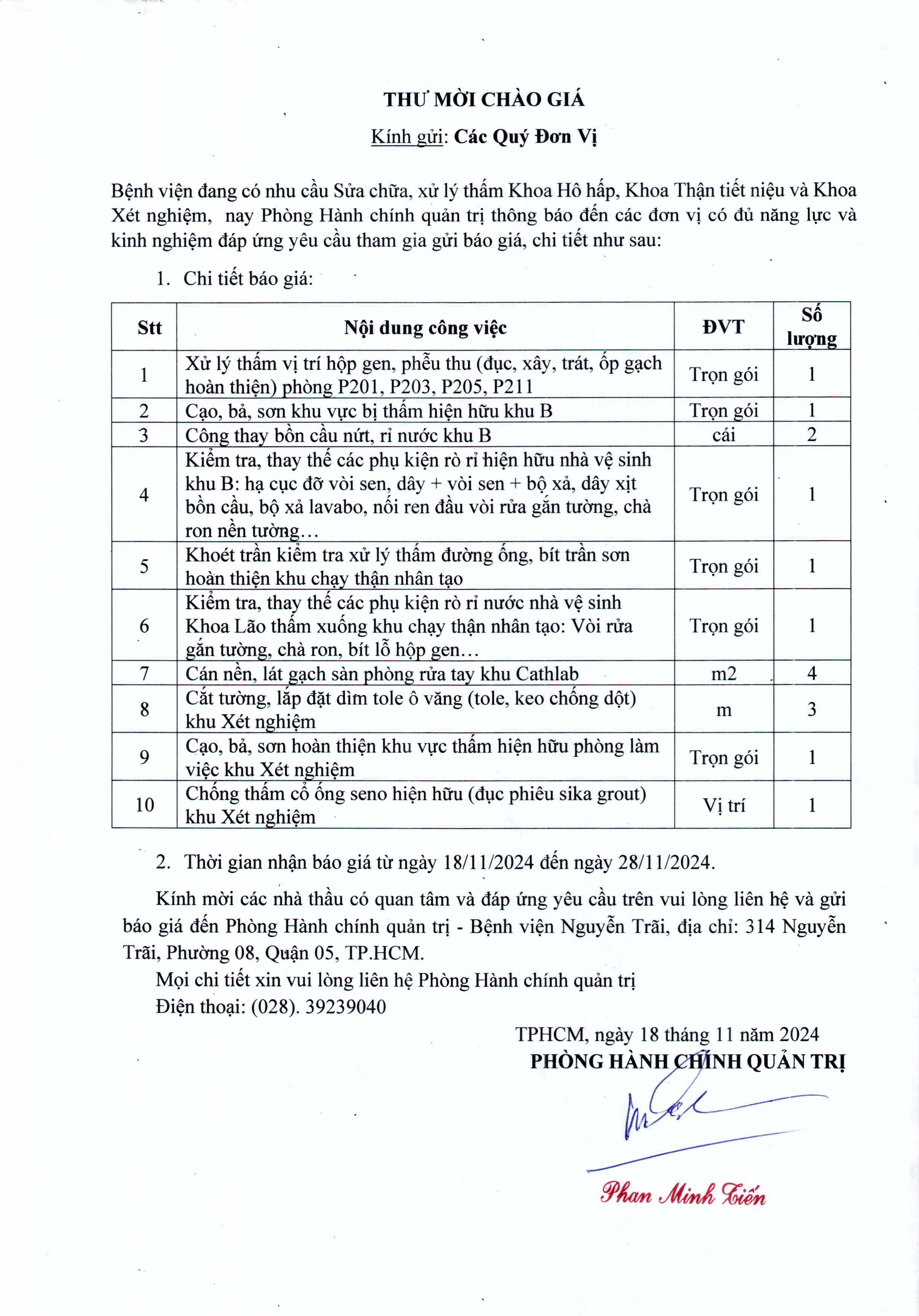 Thư mời chào giá sửa chữa, xử lý thấm khoa Thận tiết niệu, khoa Hô hấp, khoa Xét nghiệm