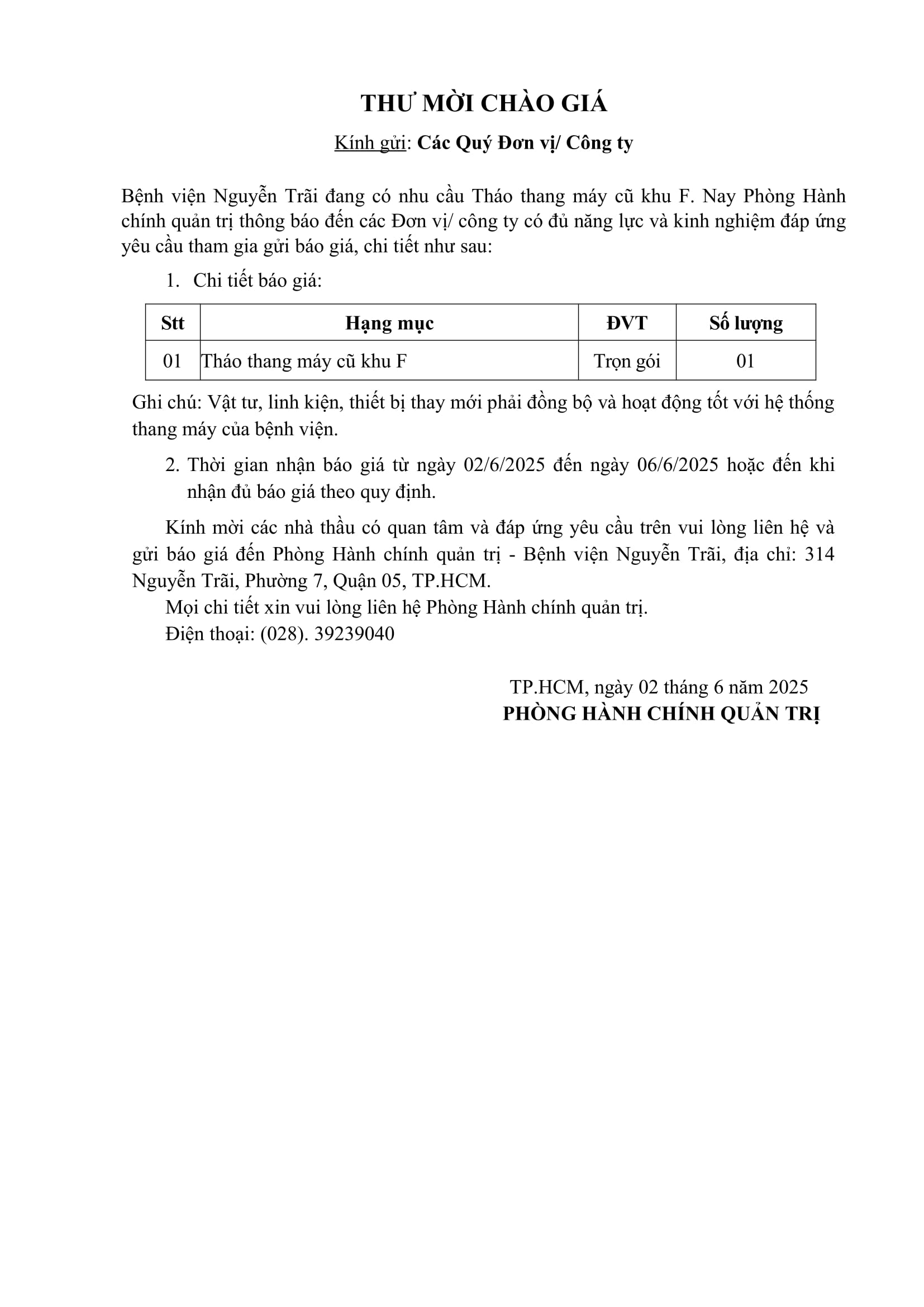 Thư mời chào giá tháo thang máy cũ khu F