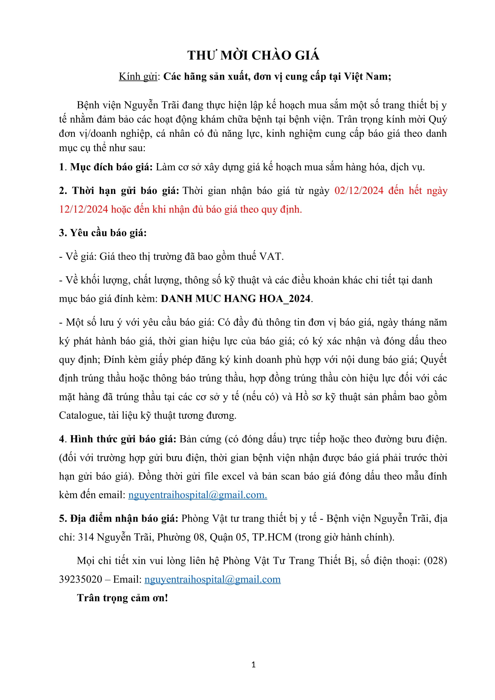 Thư mới chào giá thiết bị y tế năm 2024 bồ sung (lần 2)