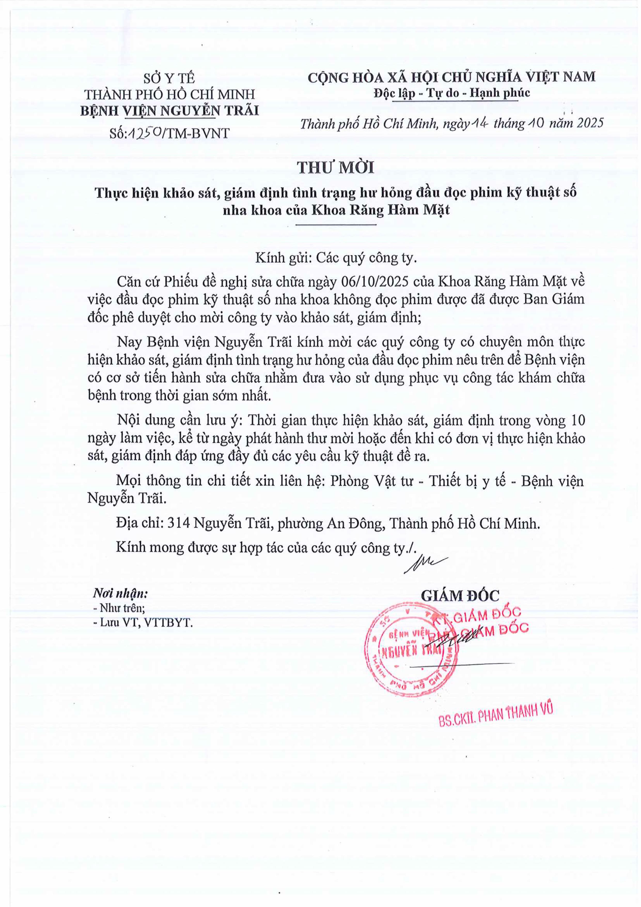 Thư mời chào giá thực hiện khảo sát, giám định tình trạng hư hỏng đầu đọc phim kỹ thuật số nha khoa của khoa Răng hàm mặt