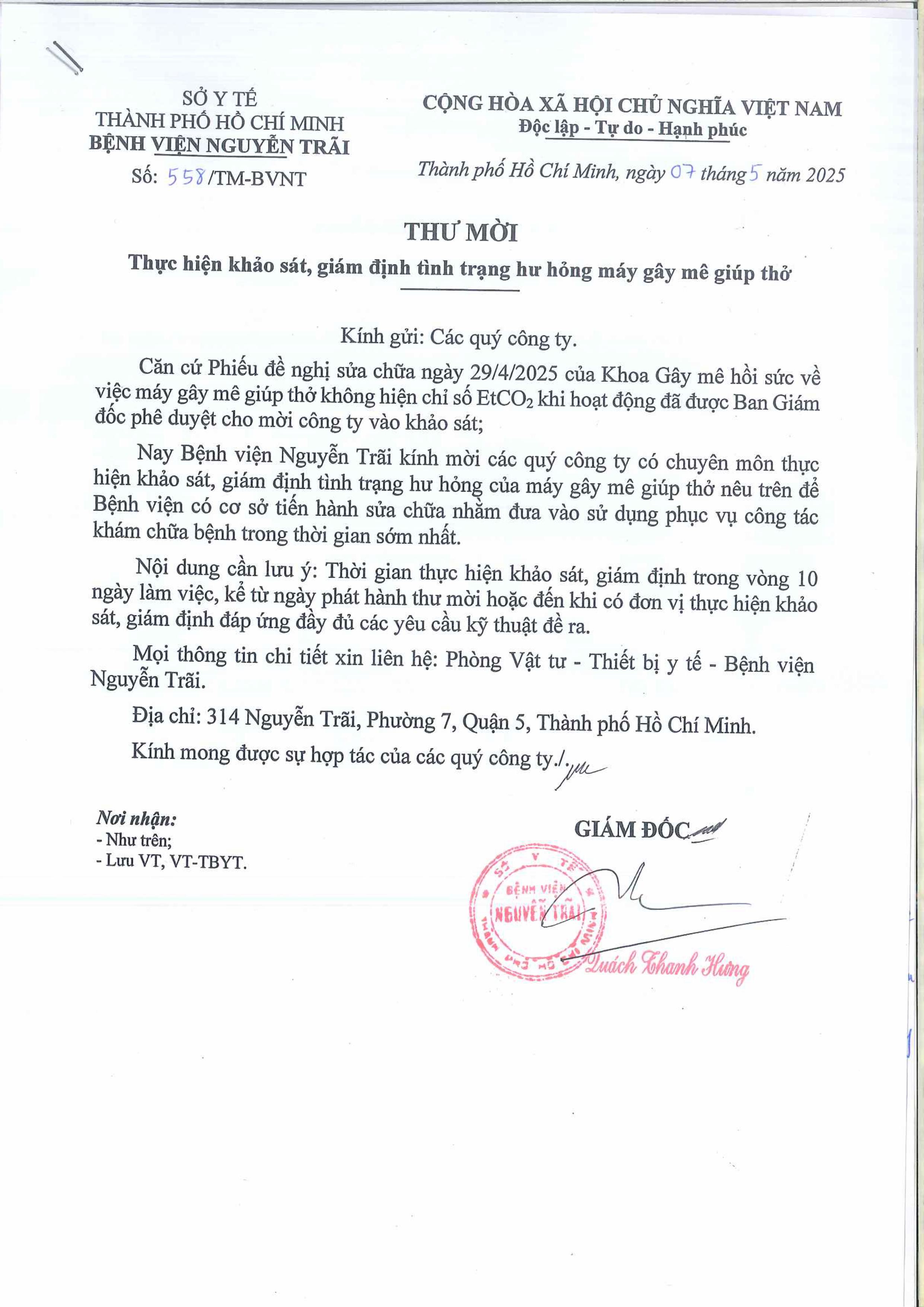 Thư mời chào giá thực hiện khảo sát, giám định tình trạng hư hỏng máy gây mê giúp thở