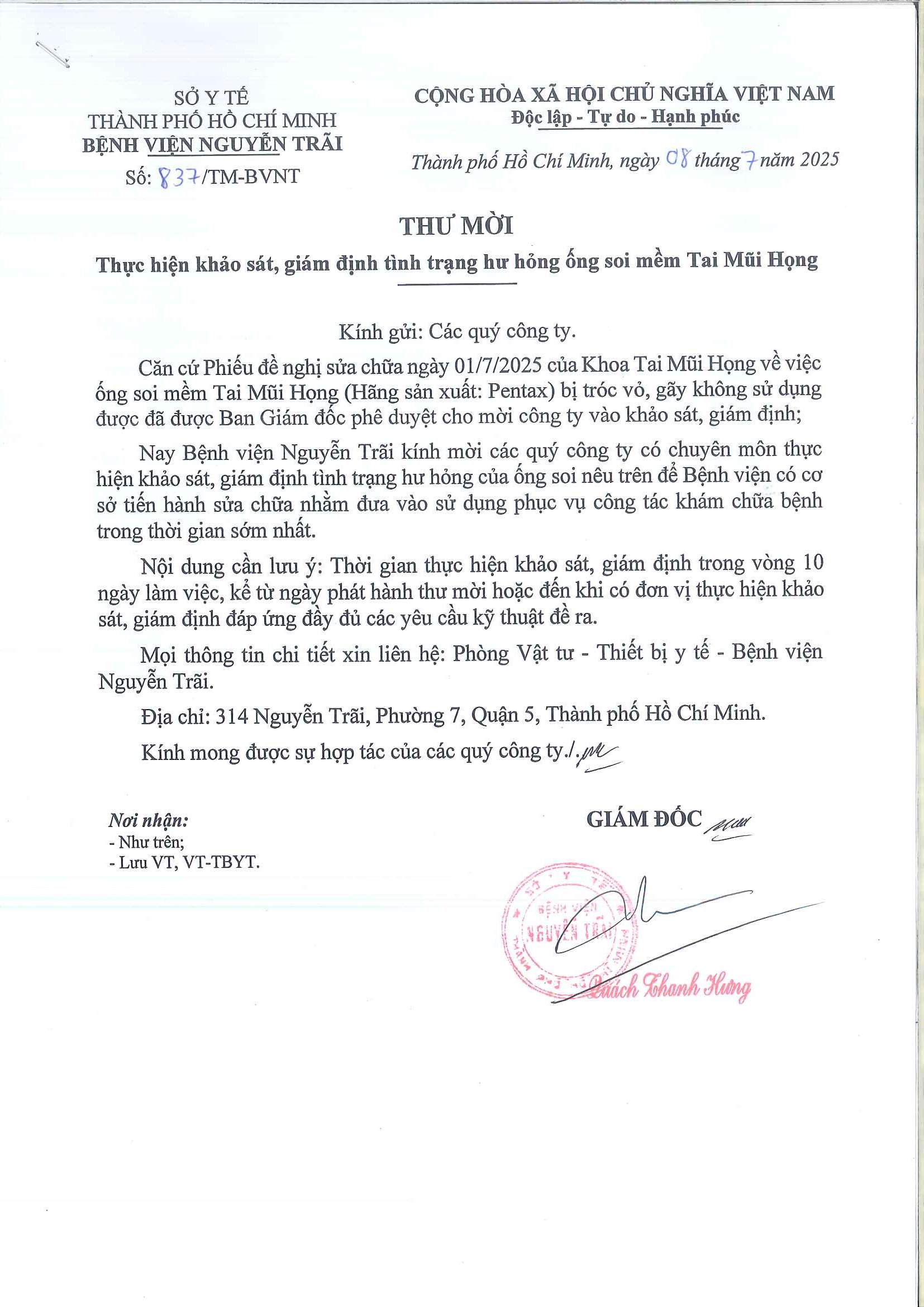 Thư mời chào giá thực hiện khảo sát, giám định tình trạng hư hỏng ống soi mềm Tai Mũi Họng