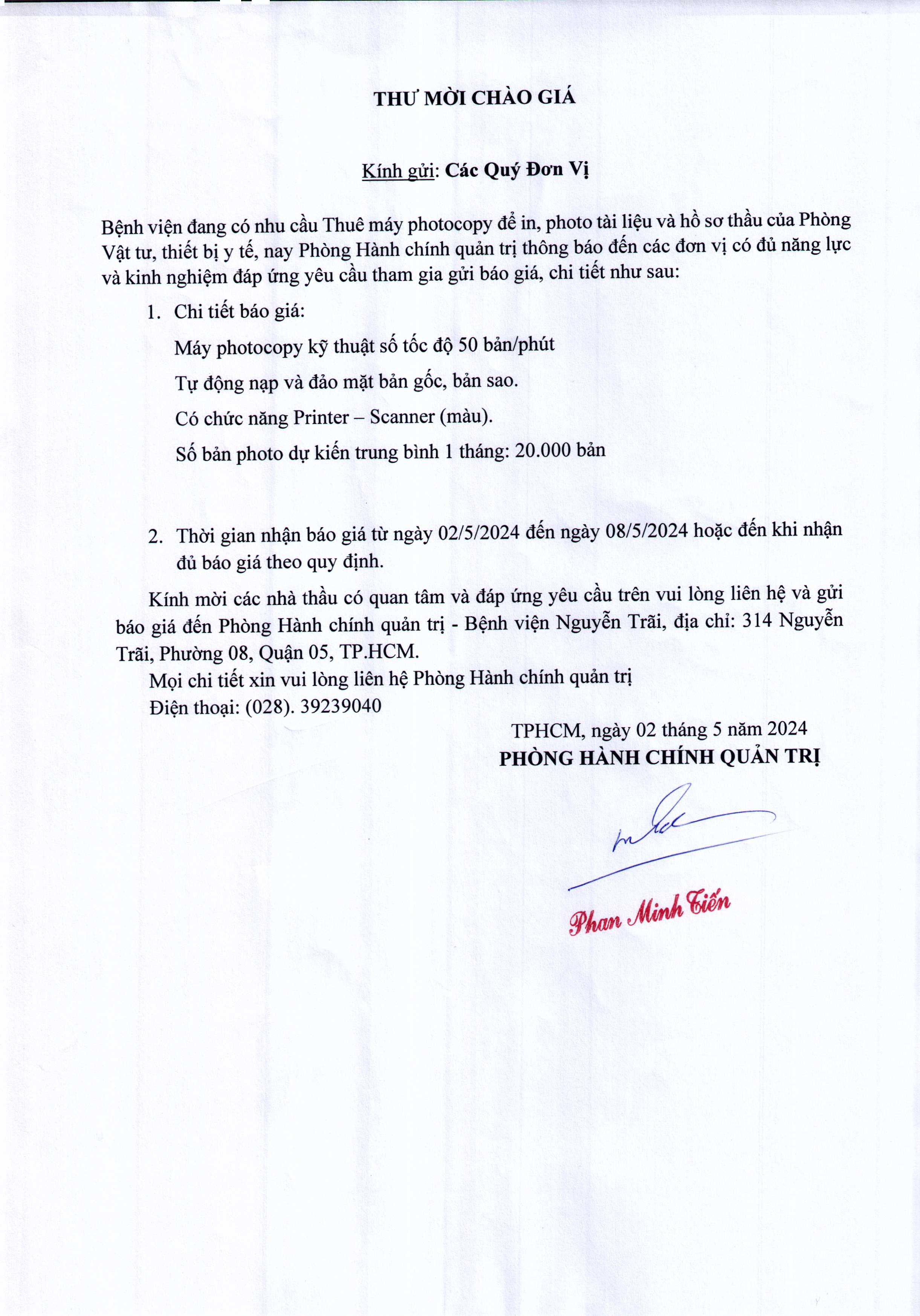 Thư mời chào giá thuê máy Photocopy