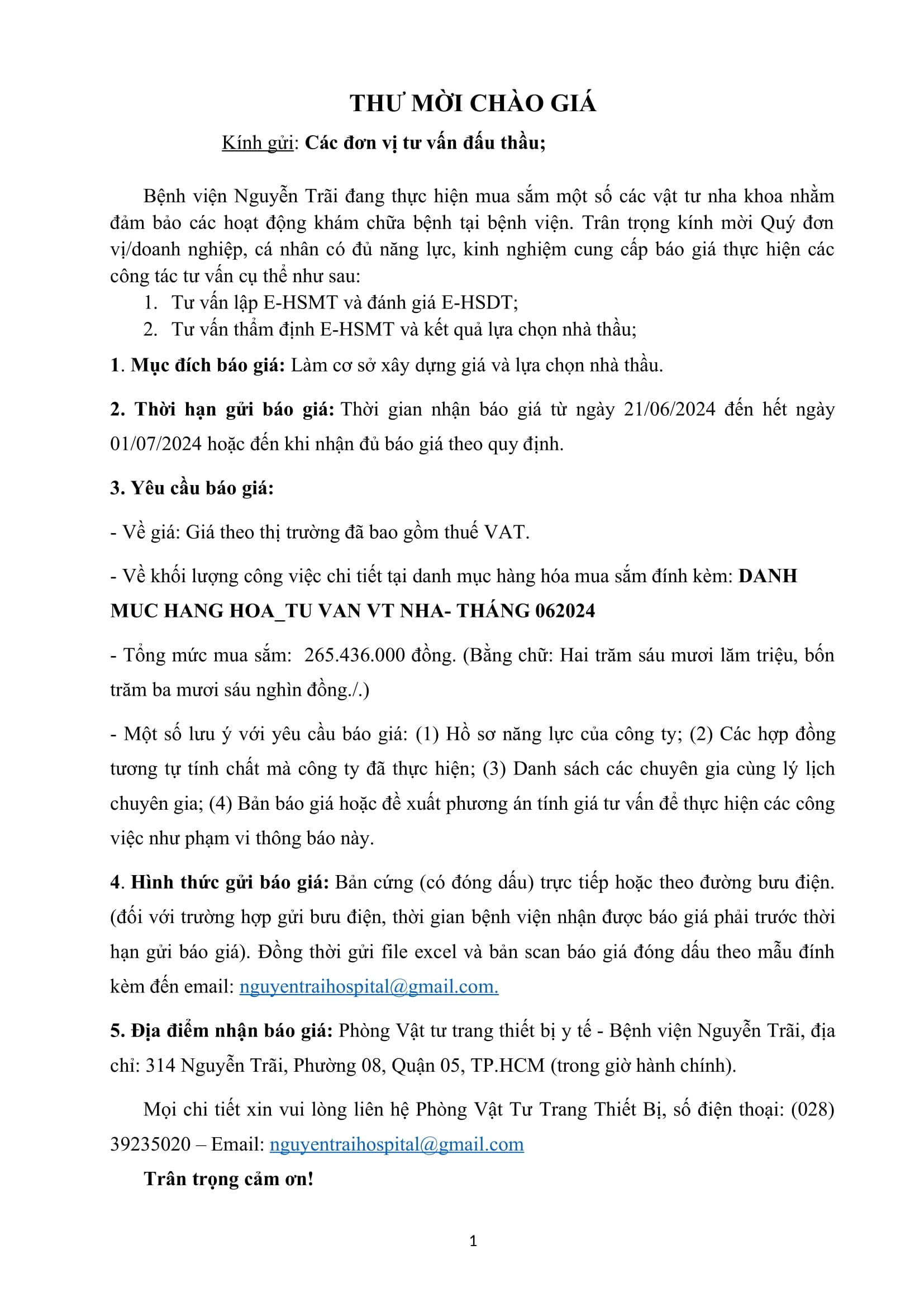 Thư mời chào giá tư vấn cho gói thầu mua sắm một số các vật tư nha khoa nhằm đảm bảo các hoạt động khám chữa bệnh tại bệnh viện Nguyễn Trãi