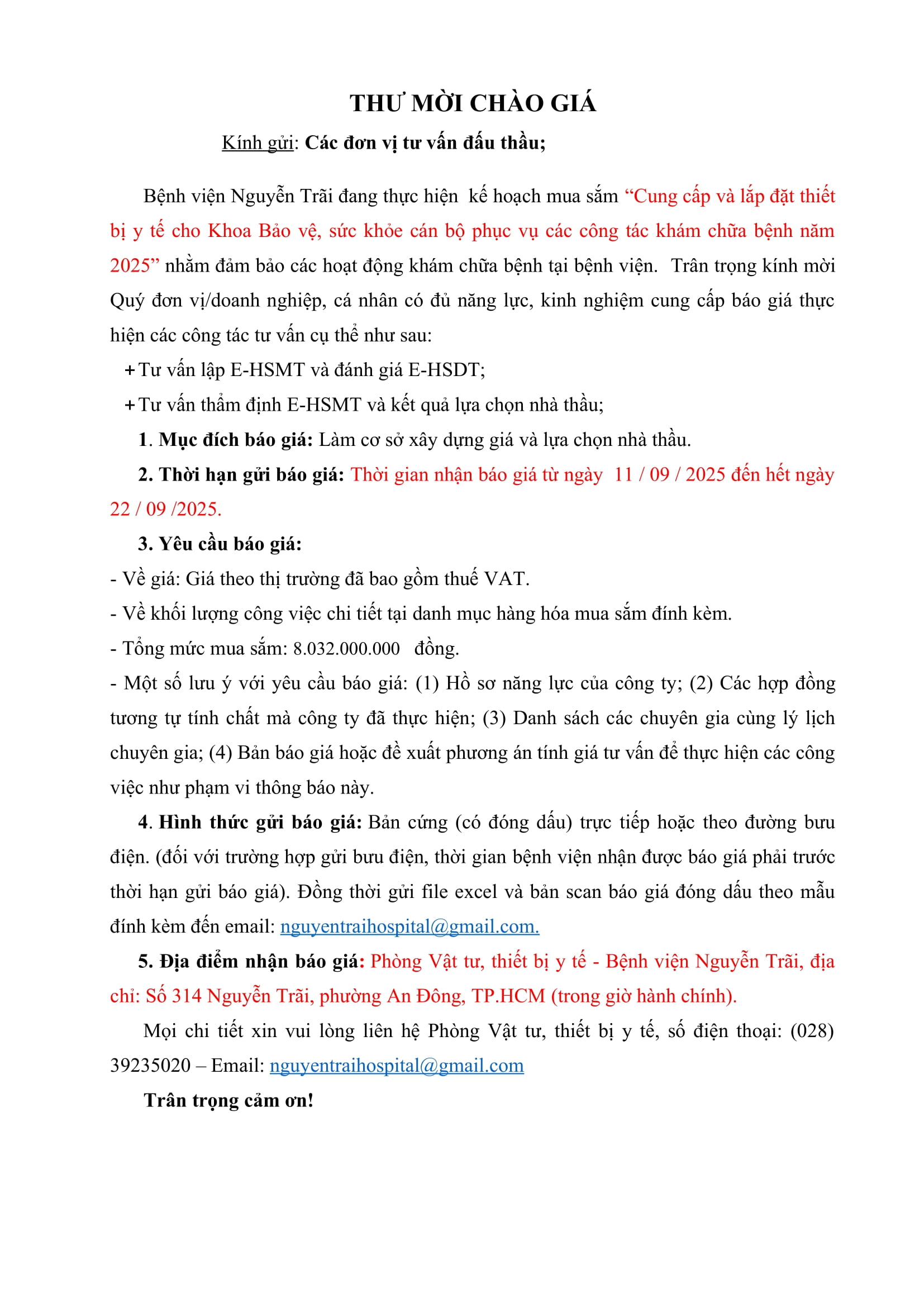 Thư mời chào giá tư vấn cho kế hoạch cung cấp và lắp đặt thiết bị y tế cho Khoa Bảo vệ, sức khỏe cán bộ phục vụ các công tác khám chữa bệnh năm 2025